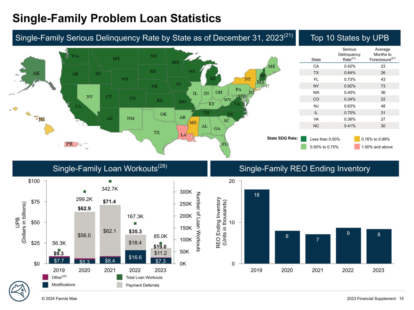 2023 Financial Supplement 15© 2024 Fannie Mae DRAFT U P B (D ol la rs in b illi on s) N um ber of Loan W orkouts $7.7 $5.3 $8.4 $16.6 $7.3 $56.0 $62.1 $18.4 $11.2 56.3K 299.2K 342.7K 167.3K 85.0K 2019 2020 2021 2022 2023 $0 $25 $50 $75 $100 0K 50K 100K 150K 200K 250K 300K R E O E nd in g In ve nt or y (U ni ts in th ou sa nd s) 18 8 7 9 8 2019 2020 2021 2022 2023 0 10 20 Single-Family Problem Loan Statistics State Serious Delinquency Rate(21) Average Months to Foreclosure(27) CA 0.42% 23 TX 0.64% 26 FL 0.73% 43 NY 0.92% 73 WA 0.40% 36 CO 0.34% 22 NJ 0.63% 48 IL 0.70% 31 VA 0.36% 27 NC 0.41% 30 Single-Family Serious Delinquency Rate by State as of December 31, 2023(21) Top 10 States by UPB Single-Family Loan Workouts(28) Single-Family REO Ending Inventory Less than 0.50% 0.76% to 0.99% 0.50% to 0.75% 1.00% and above Other(29) Total Loan Workouts Modifications Payment Deferrals $71.4 $62.9 $9.3 $35.3 $19.0 State SDQ Rate: