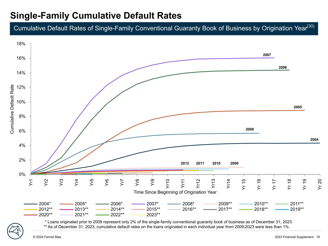 2023 Financial Supplement 16© 2024 Fannie Mae DRAFT Time Since Beginning of Origination Year C um ul at iv e D ef au lt R at e 2004* 2005* 2006* 2007* 2008* 2009** 2010** 2011** 2012** 2013** 2014** 2015** 2016** 2017** 2018** 2019** 2020** 2021** 2022** 2023** Y r1 Y r2 Y r3 Y r4 Y r5 Y r6 Y r7 Y r8 Y r9 Y r1 0 Y r1 1 Y r1 2 Y r1 3 Y r1 4 Y r 1 5 Y r 1 6 Y r 1 7 Y r 1 8 Y r 1 9 Y r 2 0 0% 2% 4% 6% 8% 10% 12% 14% 16% 18% Single-Family Cumulative Default Rates Cumulative Default Rates of Single-Family Conventional Guaranty Book of Business by Origination Year(30) * Loans originated prior to 2009 represent only 2% of the single-family conventional guaranty book of business as of December 31, 2023. ** As of December 31, 2023, cumulative default rates on the loans originated in each individual year from 2009-2023 were less than 1%. 2007 2009 2006 201020112012 2004 2008 2005