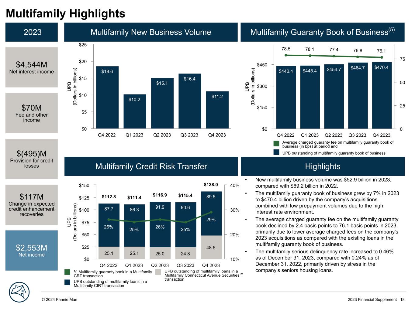 2023 Financial Supplement 18© 2024 Fannie Mae DRAFT U P B (D ol la rs in b illi on s) $440.4 $445.4 $454.7 $464.7 $470.4 78.5 78.1 77.4 76.8 76.1 Q4 2022 Q1 2023 Q2 2023 Q3 2023 Q4 2023 $0 $150 $300 $450 0 25 50 75 U P B (D ol la rs in b illi on s) $18.6 $10.2 $15.1 $16.4 $11.2 Q4 2022 Q1 2023 Q2 2023 Q3 2023 Q4 2023 $0 $5 $10 $15 $20 $25 Multifamily Highlights 2023 $4,544M Net interest income $70M Fee and other income $(495)M Provision for credit losses $117M Change in expected credit enhancement recoveries $2,553M Net income Multifamily New Business Volume Multifamily Guaranty Book of Business(5) Multifamily Credit Risk Transfer Highlights U P B (D ol la rs in b illi on s) 25.1 25.1 25.0 24.8 48.5 87.7 86.3 91.9 90.6 89.5 26% 25% 26% 25% 29% $112.8 $111.4 $116.9 $115.4 $138.0 Q4 2022 Q1 2023 Q2 2023 Q3 2023 Q4 2023 $0 $25 $50 $75 $100 $125 $150 10% 20% 30% 40% Average charged guaranty fee on multifamily guaranty book of business (in bps) at period end UPB outstanding of multifamily guaranty book of business UPB outstanding of multifamily loans in a Multifamily Connecticut Avenue SecuritiesTM transaction % Multifamily guaranty book in a Multifamily CRT transaction UPB outstanding of multifamily loans in a Multifamily CIRT transaction • New multifamily business volume was $52.9 billion in 2023, compared with $69.2 billion in 2022. • The multifamily guaranty book of business grew by 7% in 2023 to $470.4 billion driven by the company's acquisitions combined with low prepayment volumes due to the high interest rate environment. • The average charged guaranty fee on the multifamily guaranty book declined by 2.4 basis points to 76.1 basis points in 2023, primarily due to lower average charged fees on the company's 2023 acquisitions as compared with the existing loans in the multifamily guaranty book of business. • The multifamily serious delinquency rate increased to 0.46% as of December 31, 2023, compared with 0.24% as of December 31, 2022, primarily driven by stress in the company's seniors housing loans.