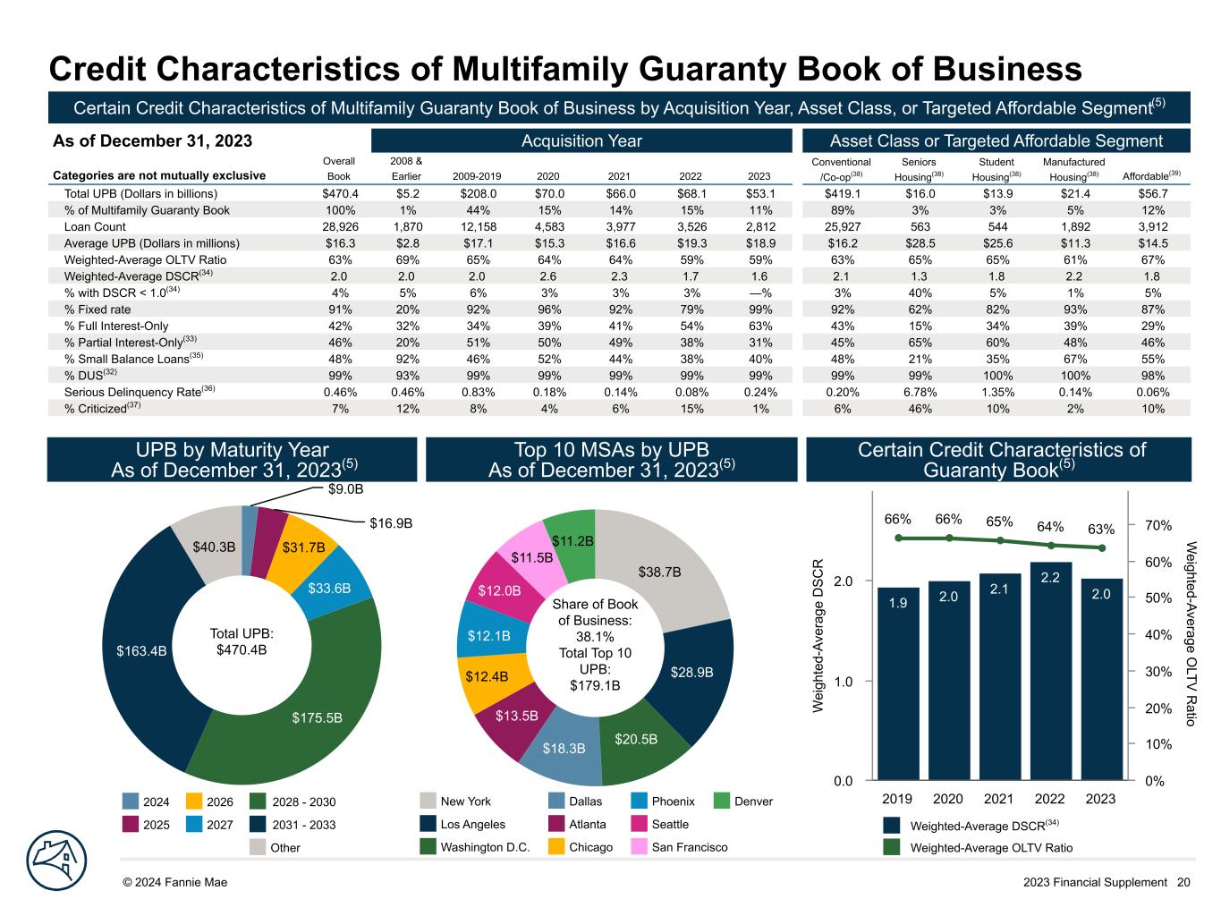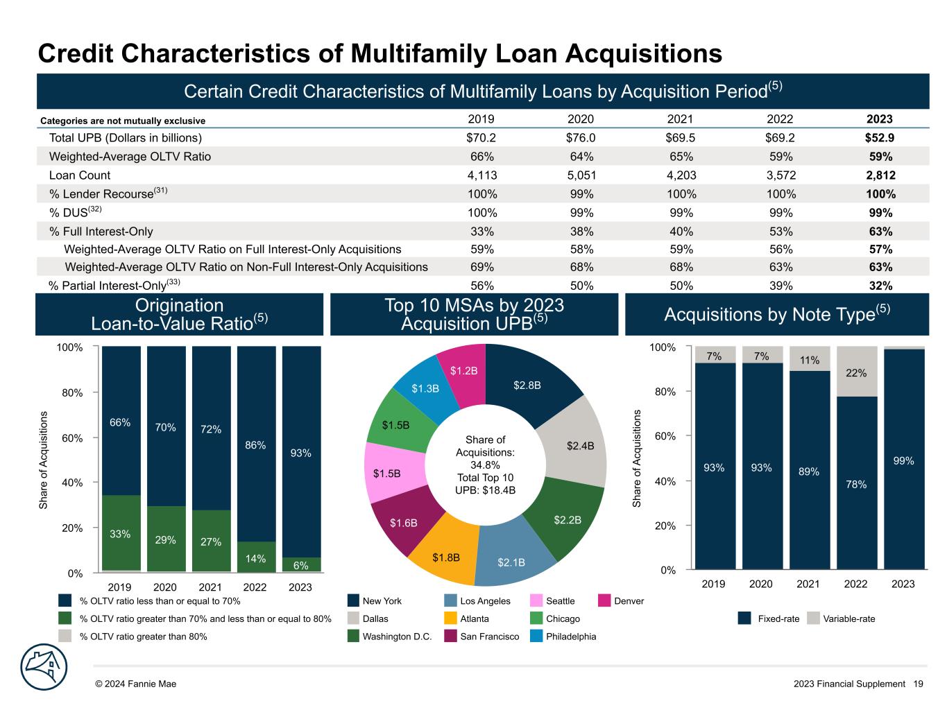 2023 Financial Supplement 19© 2024 Fannie Mae DRAFT S ha re o f A cq ui si tio ns 93% 93% 89% 78% 99% 7% 7% 11% 22% 2019 2020 2021 2022 2023 0% 20% 40% 60% 80% 100% Credit Characteristics of Multifamily Loan Acquisitions Certain Credit Characteristics of Multifamily Loans by Acquisition Period(5) Categories are not mutually exclusive 2019 2020 2021 2022 2023 Total UPB (Dollars in billions) $70.2 $76.0 $69.5 $69.2 $52.9 Weighted-Average OLTV Ratio 66% 64% 65% 59% 59% Loan Count 4,113 5,051 4,203 3,572 2,812 % Lender Recourse(31) 100% 99% 100% 100% 100% % DUS(32) 100% 99% 99% 99% 99% % Full Interest-Only 33% 38% 40% 53% 63% Weighted-Average OLTV Ratio on Full Interest-Only Acquisitions 59% 58% 59% 56% 57% Weighted-Average OLTV Ratio on Non-Full Interest-Only Acquisitions 69% 68% 68% 63% 63% % Partial Interest-Only(33) 56% 50% 50% 39% 32% S ha re o f A cq ui si tio ns 33% 29% 27% 14% 6% 66% 70% 72% 86% 93% 2019 2020 2021 2022 2023 0% 20% 40% 60% 80% 100% $2.8B $2.4B $2.2B $2.1B$1.8B $1.6B $1.5B $1.5B $1.3B $1.2B Share of Acquisitions: 34.8% Total Top 10 UPB: $18.4B Origination Loan-to-Value Ratio(5) Top 10 MSAs by 2023 Acquisition UPB(5) Acquisitions by Note Type(5) % OLTV ratio less than or equal to 70% % OLTV ratio greater than 70% and less than or equal to 80% % OLTV ratio greater than 80% Fixed-rate Variable-rate New York Los Angeles Seattle Denver Dallas Atlanta Chicago Washington D.C. San Francisco Philadelphia