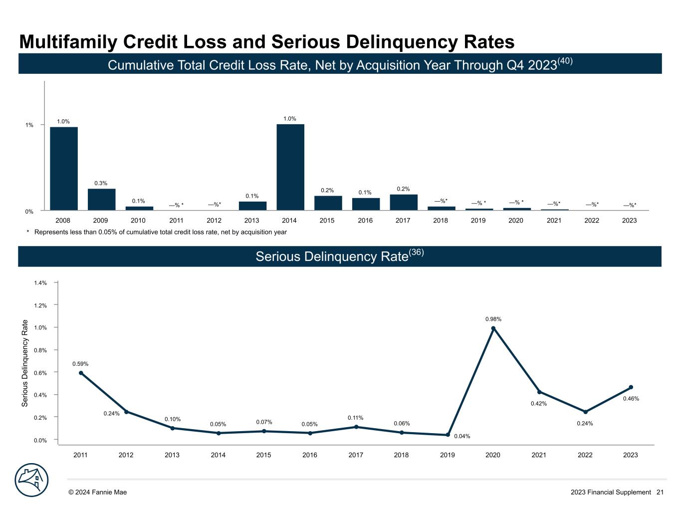 2023 Financial Supplement 21© 2024 Fannie Mae DRAFT S er io us D el in qu en cy R at e 0.59% 0.24% 0.10% 0.05% 0.07% 0.05% 0.11% 0.06% 0.04% 0.98% 0.42% 0.24% 0.46% 2011 2012 2013 2014 2015 2016 2017 2018 2019 2020 2021 2022 2023 0.0% 0.2% 0.4% 0.6% 0.8% 1.0% 1.2% 1.4% Multifamily Credit Loss and Serious Delinquency Rates 1.0% 0.3% 0.1% —% * —%* 0.1% 1.0% 0.2% 0.1% 0.2% —%* —% * —% * —%* —%* —%* 2008 2009 2010 2011 2012 2013 2014 2015 2016 2017 2018 2019 2020 2021 2022 2023 0% 1% Serious Delinquency Rate(36) Cumulative Total Credit Loss Rate, Net by Acquisition Year Through Q4 2023(40) * Represents less than 0.05% of cumulative total credit loss rate, net by acquisition year