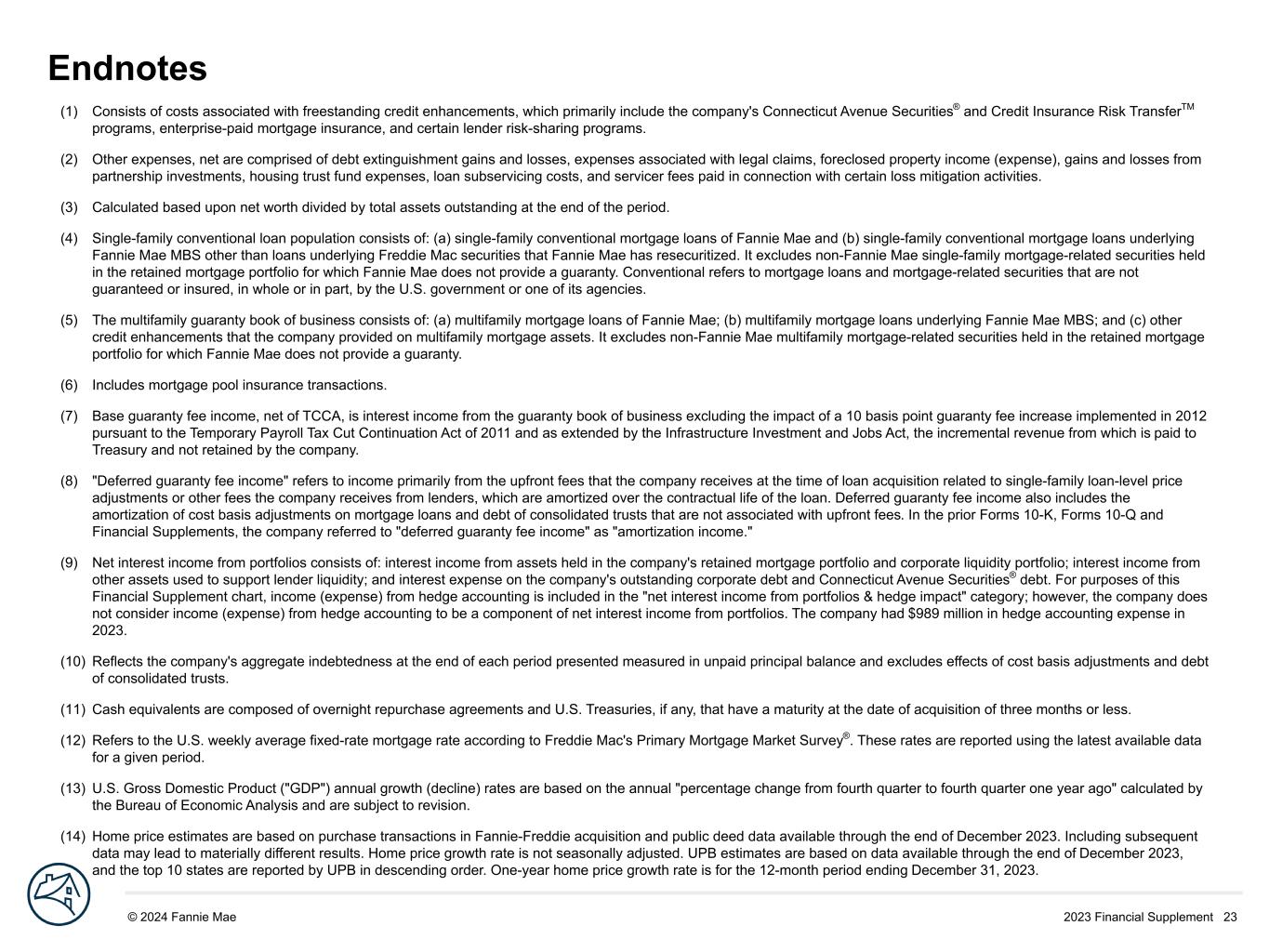 2023 Financial Supplement 23© 2024 Fannie Mae DRAFT (1) Consists of costs associated with freestanding credit enhancements, which primarily include the company's Connecticut Avenue Securities® and Credit Insurance Risk TransferTM programs, enterprise-paid mortgage insurance, and certain lender risk-sharing programs. (2) Other expenses, net are comprised of debt extinguishment gains and losses, expenses associated with legal claims, foreclosed property income (expense), gains and losses from partnership investments, housing trust fund expenses, loan subservicing costs, and servicer fees paid in connection with certain loss mitigation activities. (3) Calculated based upon net worth divided by total assets outstanding at the end of the period. (4) Single-family conventional loan population consists of: (a) single-family conventional mortgage loans of Fannie Mae and (b) single-family conventional mortgage loans underlying Fannie Mae MBS other than loans underlying Freddie Mac securities that Fannie Mae has resecuritized. It excludes non-Fannie Mae single-family mortgage-related securities held in the retained mortgage portfolio for which Fannie Mae does not provide a guaranty. Conventional refers to mortgage loans and mortgage-related securities that are not guaranteed or insured, in whole or in part, by the U.S. government or one of its agencies. (5) The multifamily guaranty book of business consists of: (a) multifamily mortgage loans of Fannie Mae; (b) multifamily mortgage loans underlying Fannie Mae MBS; and (c) other credit enhancements that the company provided on multifamily mortgage assets. It excludes non-Fannie Mae multifamily mortgage-related securities held in the retained mortgage portfolio for which Fannie Mae does not provide a guaranty. (6) Includes mortgage pool insurance transactions. (7) Base guaranty fee income, net of TCCA, is interest income from the guaranty book of business excluding the impact of a 10 basis point guaranty fee increase implemented in 2012 pursuant to the Temporary Payroll Tax Cut Continuation Act of 2011 and as extended by the Infrastructure Investment and Jobs Act, the incremental revenue from which is paid to Treasury and not retained by the company. (8) "Deferred guaranty fee income" refers to income primarily from the upfront fees that the company receives at the time of loan acquisition related to single-family loan-level price adjustments or other fees the company receives from lenders, which are amortized over the contractual life of the loan. Deferred guaranty fee income also includes the amortization of cost basis adjustments on mortgage loans and debt of consolidated trusts that are not associated with upfront fees. In the prior Forms 10-K, Forms 10-Q and Financial Supplements, the company referred to "deferred guaranty fee income" as "amortization income." (9) Net interest income from portfolios consists of: interest income from assets held in the company's retained mortgage portfolio and corporate liquidity portfolio; interest income from other assets used to support lender liquidity; and interest expense on the company's outstanding corporate debt and Connecticut Avenue Securities® debt. For purposes of this Financial Supplement chart, income (expense) from hedge accounting is included in the "net interest income from portfolios & hedge impact" category; however, the company does not consider income (expense) from hedge accounting to be a component of net interest income from portfolios. The company had $989 million in hedge accounting expense in 2023. (10) Reflects the company's aggregate indebtedness at the end of each period presented measured in unpaid principal balance and excludes effects of cost basis adjustments and debt of consolidated trusts. (11) Cash equivalents are composed of overnight repurchase agreements and U.S. Treasuries, if any, that have a maturity at the date of acquisition of three months or less. (12) Refers to the U.S. weekly average fixed-rate mortgage rate according to Freddie Mac's Primary Mortgage Market Survey®. These rates are reported using the latest available data for a given period. (13) U.S. Gross Domestic Product ("GDP") annual growth (decline) rates are based on the annual "percentage change from fourth quarter to fourth quarter one year ago" calculated by the Bureau of Economic Analysis and are subject to revision. (14) Home price estimates are based on purchase transactions in Fannie-Freddie acquisition and public deed data available through the end of December 2023. Including subsequent data may lead to materially different results. Home price growth rate is not seasonally adjusted. UPB estimates are based on data available through the end of December 2023, and the top 10 states are reported by UPB in descending order. One-year home price growth rate is for the 12-month period ending December 31, 2023. Endnotes