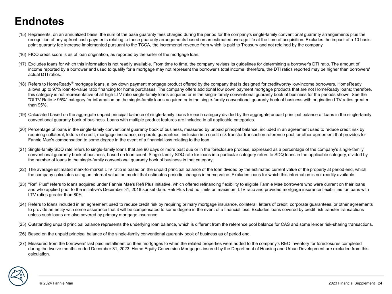 2023 Financial Supplement 24© 2024 Fannie Mae DRAFT Endnotes (15) Represents, on an annualized basis, the sum of the base guaranty fees charged during the period for the company's single-family conventional guaranty arrangements plus the recognition of any upfront cash payments relating to these guaranty arrangements based on an estimated average life at the time of acquisition. Excludes the impact of a 10 basis point guaranty fee increase implemented pursuant to the TCCA, the incremental revenue from which is paid to Treasury and not retained by the company. (16) FICO credit score is as of loan origination, as reported by the seller of the mortgage loan. (17) Excludes loans for which this information is not readily available. From time to time, the company revises its guidelines for determining a borrower's DTI ratio. The amount of income reported by a borrower and used to qualify for a mortgage may not represent the borrower's total income; therefore, the DTI ratios reported may be higher than borrowers' actual DTI ratios. (18) Refers to HomeReady® mortgage loans, a low down payment mortgage product offered by the company that is designed for creditworthy low-income borrowers. HomeReady allows up to 97% loan-to-value ratio financing for home purchases. The company offers additional low down payment mortgage products that are not HomeReady loans; therefore, this category is not representative of all high LTV ratio single-family loans acquired or in the single-family conventional guaranty book of business for the periods shown. See the "OLTV Ratio > 95%" category for information on the single-family loans acquired or in the single-family conventional guaranty book of business with origination LTV ratios greater than 95%. (19) Calculated based on the aggregate unpaid principal balance of single-family loans for each category divided by the aggregate unpaid principal balance of loans in the single-family conventional guaranty book of business. Loans with multiple product features are included in all applicable categories. (20) Percentage of loans in the single-family conventional guaranty book of business, measured by unpaid principal balance, included in an agreement used to reduce credit risk by requiring collateral, letters of credit, mortgage insurance, corporate guarantees, inclusion in a credit risk transfer transaction reference pool, or other agreement that provides for Fannie Mae's compensation to some degree in the event of a financial loss relating to the loan. (21) Single-family SDQ rate refers to single-family loans that are 90 days or more past due or in the foreclosure process, expressed as a percentage of the company’s single-family conventional guaranty book of business, based on loan count. Single-family SDQ rate for loans in a particular category refers to SDQ loans in the applicable category, divided by the number of loans in the single-family conventional guaranty book of business in that category. (22) The average estimated mark-to-market LTV ratio is based on the unpaid principal balance of the loan divided by the estimated current value of the property at period end, which the company calculates using an internal valuation model that estimates periodic changes in home value. Excludes loans for which this information is not readily available. (23) "Refi Plus" refers to loans acquired under Fannie Mae's Refi Plus initiative, which offered refinancing flexibility to eligible Fannie Mae borrowers who were current on their loans and who applied prior to the initiative's December 31, 2018 sunset date. Refi Plus had no limits on maximum LTV ratio and provided mortgage insurance flexibilities for loans with LTV ratios greater than 80%. (24) Refers to loans included in an agreement used to reduce credit risk by requiring primary mortgage insurance, collateral, letters of credit, corporate guarantees, or other agreements to provide an entity with some assurance that it will be compensated to some degree in the event of a financial loss. Excludes loans covered by credit risk transfer transactions unless such loans are also covered by primary mortgage insurance. (25) Outstanding unpaid principal balance represents the underlying loan balance, which is different from the reference pool balance for CAS and some lender risk-sharing transactions. (26) Based on the unpaid principal balance of the single-family conventional guaranty book of business as of period end. (27) Measured from the borrowers' last paid installment on their mortgages to when the related properties were added to the company's REO inventory for foreclosures completed during the twelve months ended December 31, 2023. Home Equity Conversion Mortgages insured by the Department of Housing and Urban Development are excluded from this calculation.