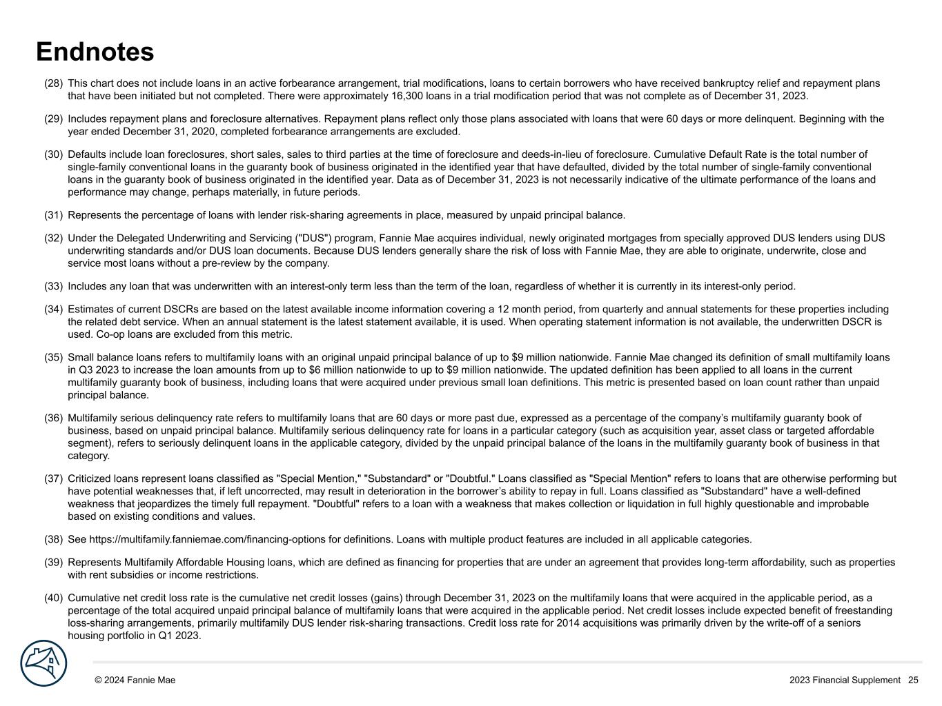 2023 Financial Supplement 25© 2024 Fannie Mae DRAFT (28) This chart does not include loans in an active forbearance arrangement, trial modifications, loans to certain borrowers who have received bankruptcy relief and repayment plans that have been initiated but not completed. There were approximately 16,300 loans in a trial modification period that was not complete as of December 31, 2023. (29) Includes repayment plans and foreclosure alternatives. Repayment plans reflect only those plans associated with loans that were 60 days or more delinquent. Beginning with the year ended December 31, 2020, completed forbearance arrangements are excluded. (30) Defaults include loan foreclosures, short sales, sales to third parties at the time of foreclosure and deeds-in-lieu of foreclosure. Cumulative Default Rate is the total number of single-family conventional loans in the guaranty book of business originated in the identified year that have defaulted, divided by the total number of single-family conventional loans in the guaranty book of business originated in the identified year. Data as of December 31, 2023 is not necessarily indicative of the ultimate performance of the loans and performance may change, perhaps materially, in future periods. (31) Represents the percentage of loans with lender risk-sharing agreements in place, measured by unpaid principal balance. (32) Under the Delegated Underwriting and Servicing ("DUS") program, Fannie Mae acquires individual, newly originated mortgages from specially approved DUS lenders using DUS underwriting standards and/or DUS loan documents. Because DUS lenders generally share the risk of loss with Fannie Mae, they are able to originate, underwrite, close and service most loans without a pre-review by the company. (33) Includes any loan that was underwritten with an interest-only term less than the term of the loan, regardless of whether it is currently in its interest-only period. (34) Estimates of current DSCRs are based on the latest available income information covering a 12 month period, from quarterly and annual statements for these properties including the related debt service. When an annual statement is the latest statement available, it is used. When operating statement information is not available, the underwritten DSCR is used. Co-op loans are excluded from this metric. (35) Small balance loans refers to multifamily loans with an original unpaid principal balance of up to $9 million nationwide. Fannie Mae changed its definition of small multifamily loans in Q3 2023 to increase the loan amounts from up to $6 million nationwide to up to $9 million nationwide. The updated definition has been applied to all loans in the current multifamily guaranty book of business, including loans that were acquired under previous small loan definitions. This metric is presented based on loan count rather than unpaid principal balance. (36) Multifamily serious delinquency rate refers to multifamily loans that are 60 days or more past due, expressed as a percentage of the company’s multifamily guaranty book of business, based on unpaid principal balance. Multifamily serious delinquency rate for loans in a particular category (such as acquisition year, asset class or targeted affordable segment), refers to seriously delinquent loans in the applicable category, divided by the unpaid principal balance of the loans in the multifamily guaranty book of business in that category. (37) Criticized loans represent loans classified as "Special Mention," "Substandard" or "Doubtful." Loans classified as "Special Mention" refers to loans that are otherwise performing but have potential weaknesses that, if left uncorrected, may result in deterioration in the borrower’s ability to repay in full. Loans classified as "Substandard" have a well-defined weakness that jeopardizes the timely full repayment. "Doubtful" refers to a loan with a weakness that makes collection or liquidation in full highly questionable and improbable based on existing conditions and values. (38) See https://multifamily.fanniemae.com/financing-options for definitions. Loans with multiple product features are included in all applicable categories. (39) Represents Multifamily Affordable Housing loans, which are defined as financing for properties that are under an agreement that provides long-term affordability, such as properties with rent subsidies or income restrictions. (40) Cumulative net credit loss rate is the cumulative net credit losses (gains) through December 31, 2023 on the multifamily loans that were acquired in the applicable period, as a percentage of the total acquired unpaid principal balance of multifamily loans that were acquired in the applicable period. Net credit losses include expected benefit of freestanding loss-sharing arrangements, primarily multifamily DUS lender risk-sharing transactions. Credit loss rate for 2014 acquisitions was primarily driven by the write-off of a seniors housing portfolio in Q1 2023. Endnotes