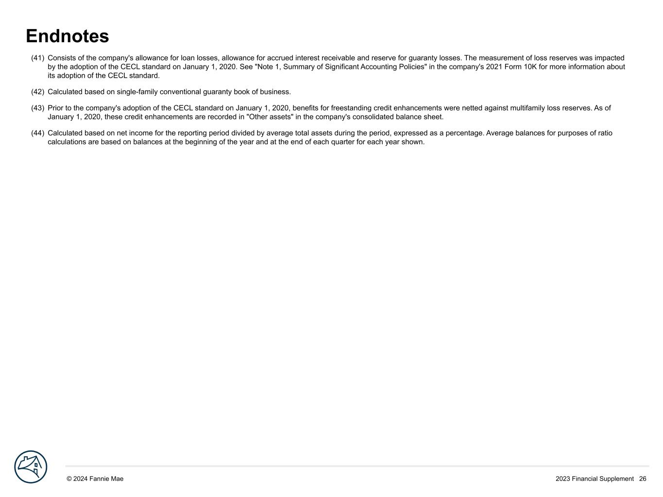 2023 Financial Supplement 26© 2024 Fannie Mae DRAFT Endnotes (41) Consists of the company's allowance for loan losses, allowance for accrued interest receivable and reserve for guaranty losses. The measurement of loss reserves was impacted by the adoption of the CECL standard on January 1, 2020. See "Note 1, Summary of Significant Accounting Policies" in the company's 2021 Form 10K for more information about its adoption of the CECL standard. (42) Calculated based on single-family conventional guaranty book of business. (43) Prior to the company's adoption of the CECL standard on January 1, 2020, benefits for freestanding credit enhancements were netted against multifamily loss reserves. As of January 1, 2020, these credit enhancements are recorded in "Other assets" in the company's consolidated balance sheet. (44) Calculated based on net income for the reporting period divided by average total assets during the period, expressed as a percentage. Average balances for purposes of ratio calculations are based on balances at the beginning of the year and at the end of each quarter for each year shown.