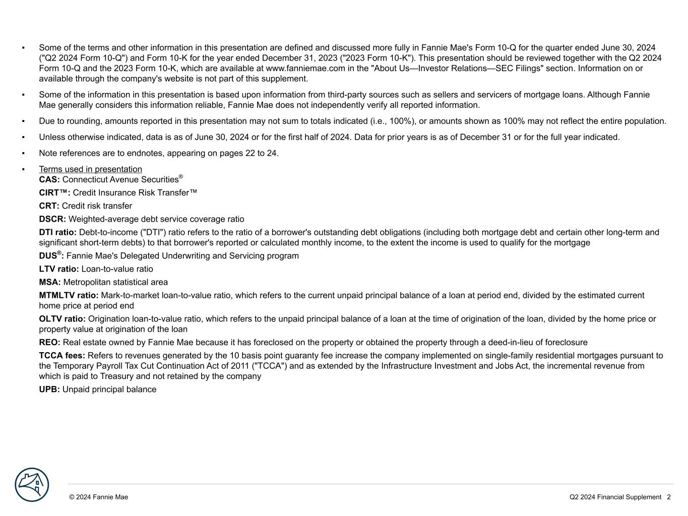 Q2 2024 Financial Supplement 2© 2024 Fannie Mae DRAFT ▪ Some of the terms and other information in this presentation are defined and discussed more fully in Fannie Mae's Form 10-Q for the quarter ended June 30, 2024 ("Q2 2024 Form 10-Q") and Form 10-K for the year ended December 31, 2023 ("2023 Form 10-K"). This presentation should be reviewed together with the Q2 2024 Form 10-Q and the 2023 Form 10-K, which are available at www.fanniemae.com in the "About Us—Investor Relations—SEC Filings" section. Information on or available through the company's website is not part of this supplement. ▪ Some of the information in this presentation is based upon information from third-party sources such as sellers and servicers of mortgage loans. Although Fannie Mae generally considers this information reliable, Fannie Mae does not independently verify all reported information. ▪ Due to rounding, amounts reported in this presentation may not sum to totals indicated (i.e., 100%), or amounts shown as 100% may not reflect the entire population. ▪ Unless otherwise indicated, data is as of June 30, 2024 or for the first half of 2024. Data for prior years is as of December 31 or for the full year indicated. ▪ Note references are to endnotes, appearing on pages 22 to 24. ▪ Terms used in presentation CAS: Connecticut Avenue Securities® CIRT™: Credit Insurance Risk Transfer™ CRT: Credit risk transfer DSCR: Weighted-average debt service coverage ratio DTI ratio: Debt-to-income ("DTI") ratio refers to the ratio of a borrower's outstanding debt obligations (including both mortgage debt and certain other long-term and significant short-term debts) to that borrower's reported or calculated monthly income, to the extent the income is used to qualify for the mortgage DUS®: Fannie Mae's Delegated Underwriting and Servicing program LTV ratio: Loan-to-value ratio MSA: Metropolitan statistical area MTMLTV ratio: Mark-to-market loan-to-value ratio, which refers to the current unpaid principal balance of a loan at period end, divided by the estimated current home price at period end OLTV ratio: Origination loan-to-value ratio, which refers to the unpaid principal balance of a loan at the time of origination of the loan, divided by the home price or property value at origination of the loan REO: Real estate owned by Fannie Mae because it has foreclosed on the property or obtained the property through a deed-in-lieu of foreclosure TCCA fees: Refers to revenues generated by the 10 basis point guaranty fee increase the company implemented on single-family residential mortgages pursuant to the Temporary Payroll Tax Cut Continuation Act of 2011 ("TCCA") and as extended by the Infrastructure Investment and Jobs Act, the incremental revenue from which is paid to Treasury and not retained by the company UPB: Unpaid principal balance