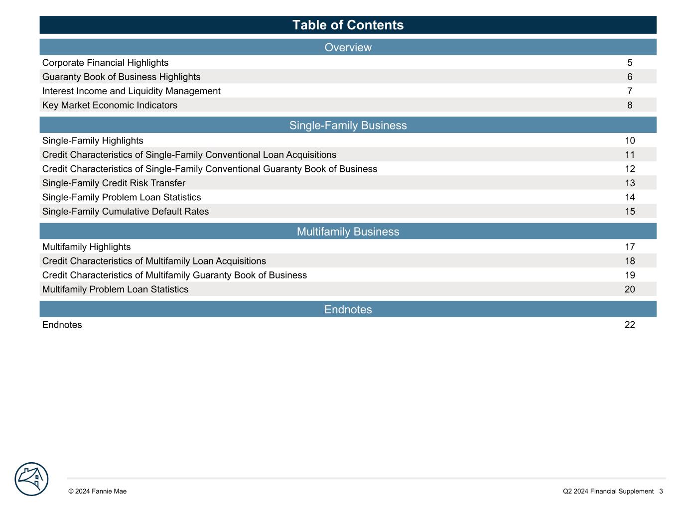 Q2 2024 Financial Supplement 3© 2024 Fannie Mae DRAFTTable of Contents Overview Corporate Financial Highlights 5 Guaranty Book of Business Highlights 6 Interest Income and Liquidity Management 7 Key Market Economic Indicators 8 Single-Family Business Single-Family Highlights 10 Credit Characteristics of Single-Family Conventional Loan Acquisitions 11 Credit Characteristics of Single-Family Conventional Guaranty Book of Business 12 Single-Family Credit Risk Transfer 13 Single-Family Problem Loan Statistics 14 Single-Family Cumulative Default Rates 15 Multifamily Business Multifamily Highlights 17 Credit Characteristics of Multifamily Loan Acquisitions 18 Credit Characteristics of Multifamily Guaranty Book of Business 19 Multifamily Problem Loan Statistics 20 Endnotes Endnotes 22