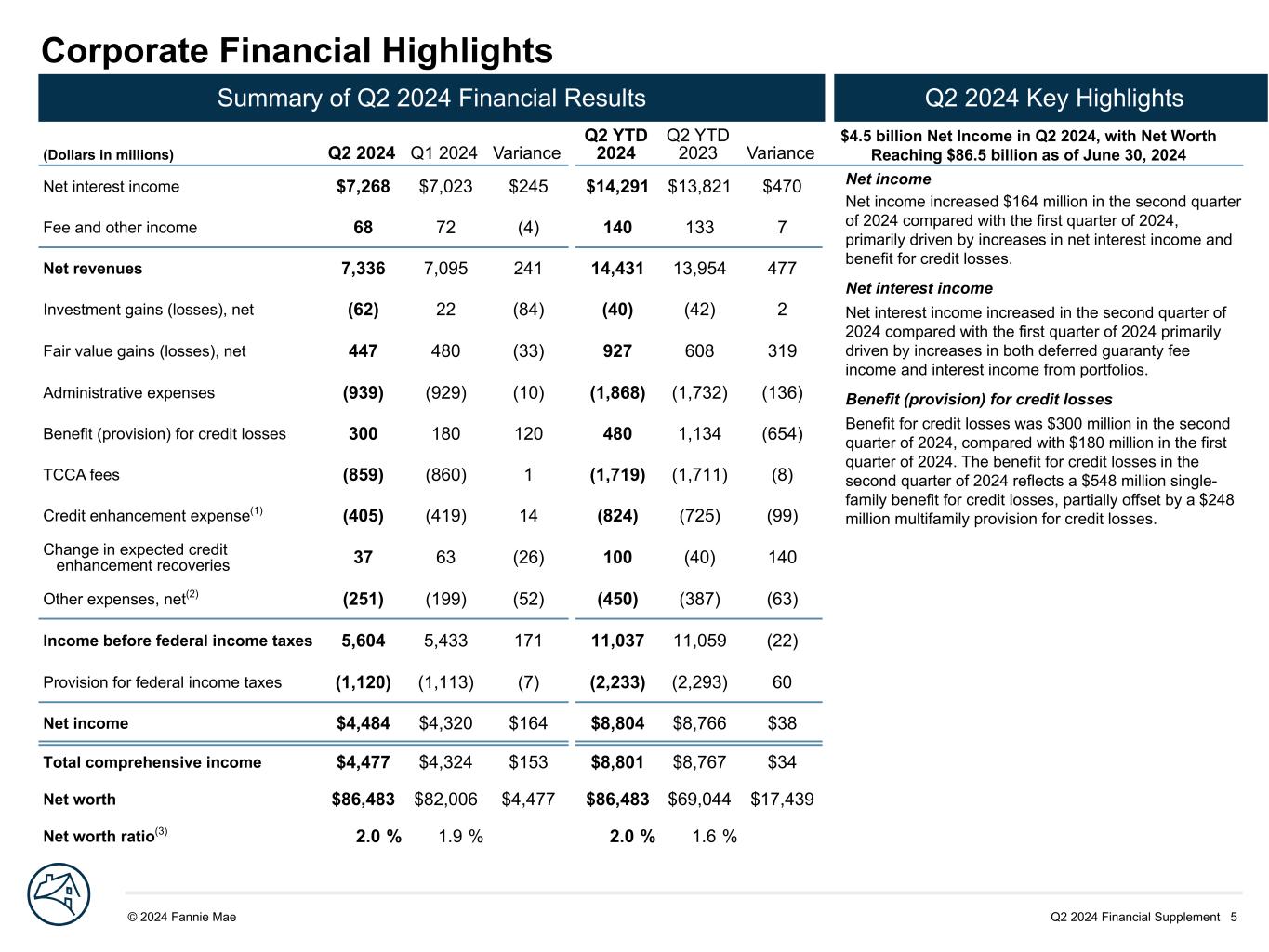 Q2 2024 Financial Supplement 5© 2024 Fannie Mae DRAFT Net income Net income increased $164 million in the second quarter of 2024 compared with the first quarter of 2024, primarily driven by increases in net interest income and benefit for credit losses. Net interest income Net interest income increased in the second quarter of 2024 compared with the first quarter of 2024 primarily driven by increases in both deferred guaranty fee income and interest income from portfolios. Benefit (provision) for credit losses Benefit for credit losses was $300 million in the second quarter of 2024, compared with $180 million in the first quarter of 2024. The benefit for credit losses in the second quarter of 2024 reflects a $548 million single- family benefit for credit losses, partially offset by a $248 million multifamily provision for credit losses. Corporate Financial Highlights (Dollars in millions) Q2 2024 Q1 2024 Variance Q2 YTD 2024 Q2 YTD 2023 Variance Net interest income $7,268 $7,023 $245 $14,291 $13,821 $470 Fee and other income 68 72 (4) 140 133 7 Net revenues 7,336 7,095 241 14,431 13,954 477 Investment gains (losses), net (62) 22 (84) (40) (42) 2 Fair value gains (losses), net 447 480 (33) 927 608 319 Administrative expenses (939) (929) (10) (1,868) (1,732) (136) Benefit (provision) for credit losses 300 180 120 480 1,134 (654) TCCA fees (859) (860) 1 (1,719) (1,711) (8) Credit enhancement expense(1) (405) (419) 14 (824) (725) (99) Change in expected credit enhancement recoveries 37 63 (26) 100 (40) 140 Other expenses, net(2) (251) (199) (52) (450) (387) (63) Income before federal income taxes 5,604 5,433 171 11,037 11,059 (22) Provision for federal income taxes (1,120) (1,113) (7) (2,233) (2,293) 60 Net income $4,484 $4,320 $164 $8,804 $8,766 $38 Total comprehensive income $4,477 $4,324 $153 $8,801 $8,767 $34 Net worth $86,483 $82,006 $4,477 $86,483 $69,044 $17,439 Net worth ratio(3) 2.0 % 1.9 % 2.0 % 1.6 % Summary of Q2 2024 Financial Results Q2 2024 Key Highlights $4.5 billion Net Income in Q2 2024, with Net Worth Reaching $86.5 billion as of June 30, 2024