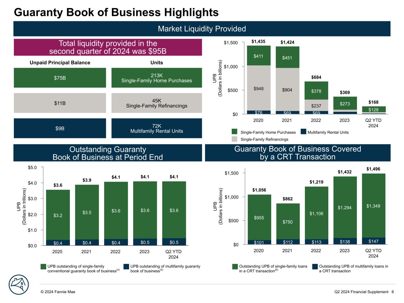 Q2 2024 Financial Supplement 6© 2024 Fannie Mae DRAFT U P B (D ol la rs in tr illi on s) $3.6 $3.9 $4.1 $4.1 $4.1 $0.4 $0.4 $0.4 $0.5 $0.5 $3.2 $3.5 $3.6 $3.6 $3.6 2020 2021 2022 2023 Q2 YTD 2024 $0.0 $1.0 $2.0 $3.0 $4.0 $5.0 Guaranty Book of Business Highlights Outstanding Guaranty Book of Business at Period End Guaranty Book of Business Covered by a CRT Transaction U P B (D ol la rs in b ill io ns ) $76 $69 $69 $948 $904 $237 $411 $451 $378 $273 $128 $1,435 $1,424 $684 $369 $168 2020 2021 2022 2023 Q2 YTD 2024 $0 $500 $1,000 $1,500 Single-Family Home Purchases Multifamily Rental Units Single-Family Refinancings Market Liquidity Provided Total liquidity provided in the second quarter of 2024 was $95B Unpaid Principal Balance Units $75B 213K Single-Family Home Purchases $11B 45K Single-Family Refinancings $9B 72K Multifamily Rental Units U P B (D ol la rs in b illi on s) $1,056 $862 $1,219 $1,432 $1,496 $101 $112 $113 $138 $147 $955 $750 $1,106 $1,294 $1,349 2020 2021 2022 2023 Q2 YTD 2024 $0 $500 $1,000 $1,500 Outstanding UPB of single-family loans in a CRT transaction(6) Outstanding UPB of multifamily loans in a CRT transaction UPB outstanding of single-family conventional guaranty book of business(4) UPB outstanding of multifamily guaranty book of business(5)