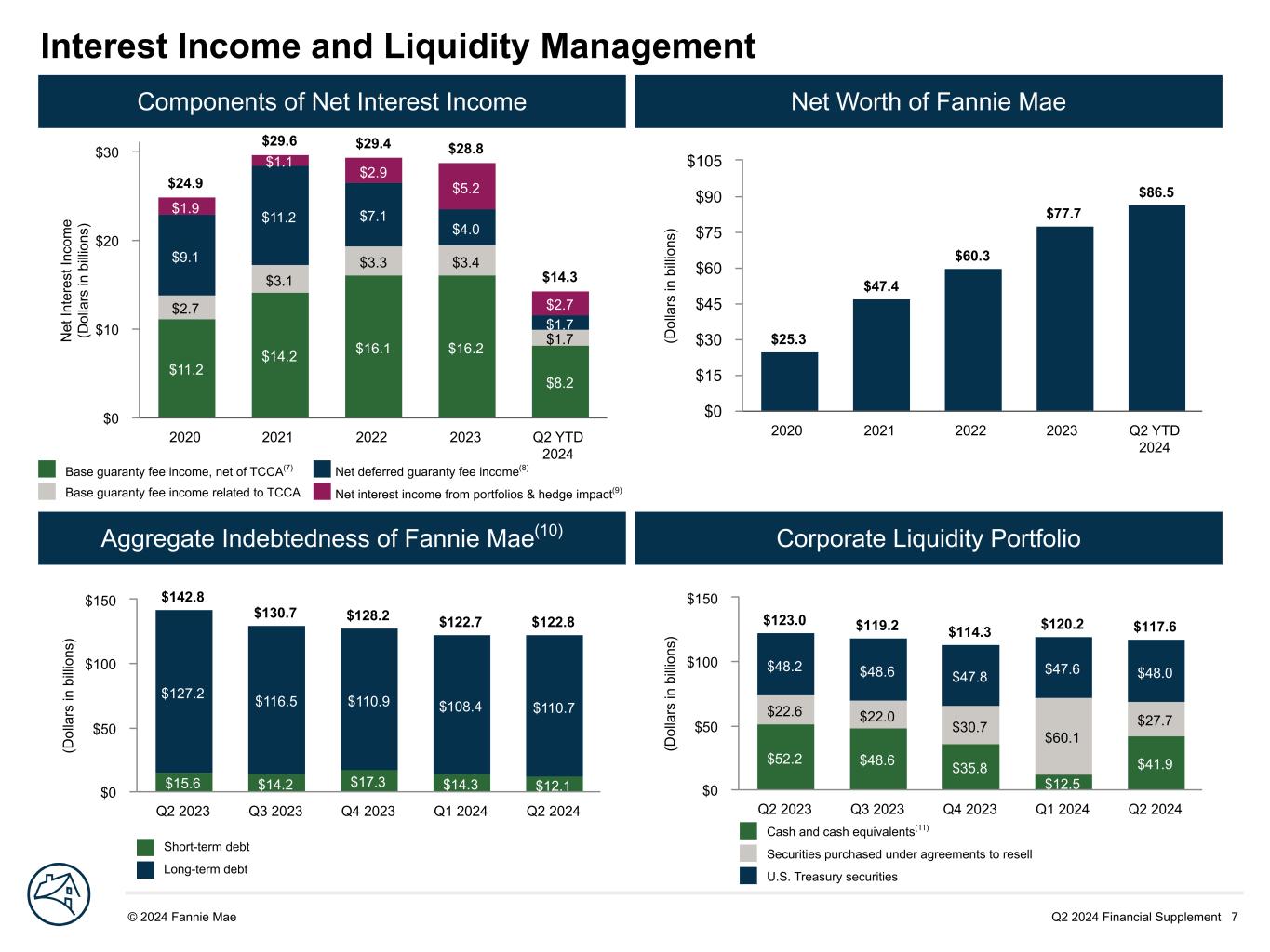 Q2 2024 Financial Supplement 7© 2024 Fannie Mae DRAFTInterest Income and Liquidity Management Components of Net Interest Income Net Worth of Fannie Mae Aggregate Indebtedness of Fannie Mae(10) Corporate Liquidity Portfolio N et In te re st In co m e (D ol la rs in b illi on s) $24.9 $29.6 $29.4 $28.8 $14.3 $11.2 $14.2 $16.1 $16.2 $8.2 $2.7 $3.1 $3.3 $3.4 $1.7 $9.1 $11.2 $7.1 $4.0 $1.7 $1.9 $1.1 $2.9 $5.2 $2.7 2020 2021 2022 2023 Q2 YTD 2024 $0 $10 $20 $30 Base guaranty fee income, net of TCCA(7) Net deferred guaranty fee income(8) Base guaranty fee income related to TCCA Net interest income from portfolios & hedge impact(9) (D ol la rs in b illi on s) $15.6 $14.2 $17.3 $14.3 $12.1 $127.2 $116.5 $110.9 $108.4 $110.7 $142.8 $130.7 $128.2 $122.7 $122.8 Q2 2023 Q3 2023 Q4 2023 Q1 2024 Q2 2024 $0 $50 $100 $150 (D ol la rs in b illi on s) $52.2 $48.6 $35.8 $12.5 $41.9 $22.6 $22.0 $30.7 $60.1 $27.7 $48.2 $48.6 $47.8 $47.6 $48.0 $123.0 $119.2 $114.3 $120.2 $117.6 Q2 2023 Q3 2023 Q4 2023 Q1 2024 Q2 2024 $0 $50 $100 $150 Cash and cash equivalents(11) Securities purchased under agreements to resell U.S. Treasury securities Short-term debt Long-term debt (D ol la rs in b illi on s) $25.3 $47.4 $60.3 $77.7 $86.5 2020 2021 2022 2023 Q2 YTD 2024 $0 $15 $30 $45 $60 $75 $90 $105