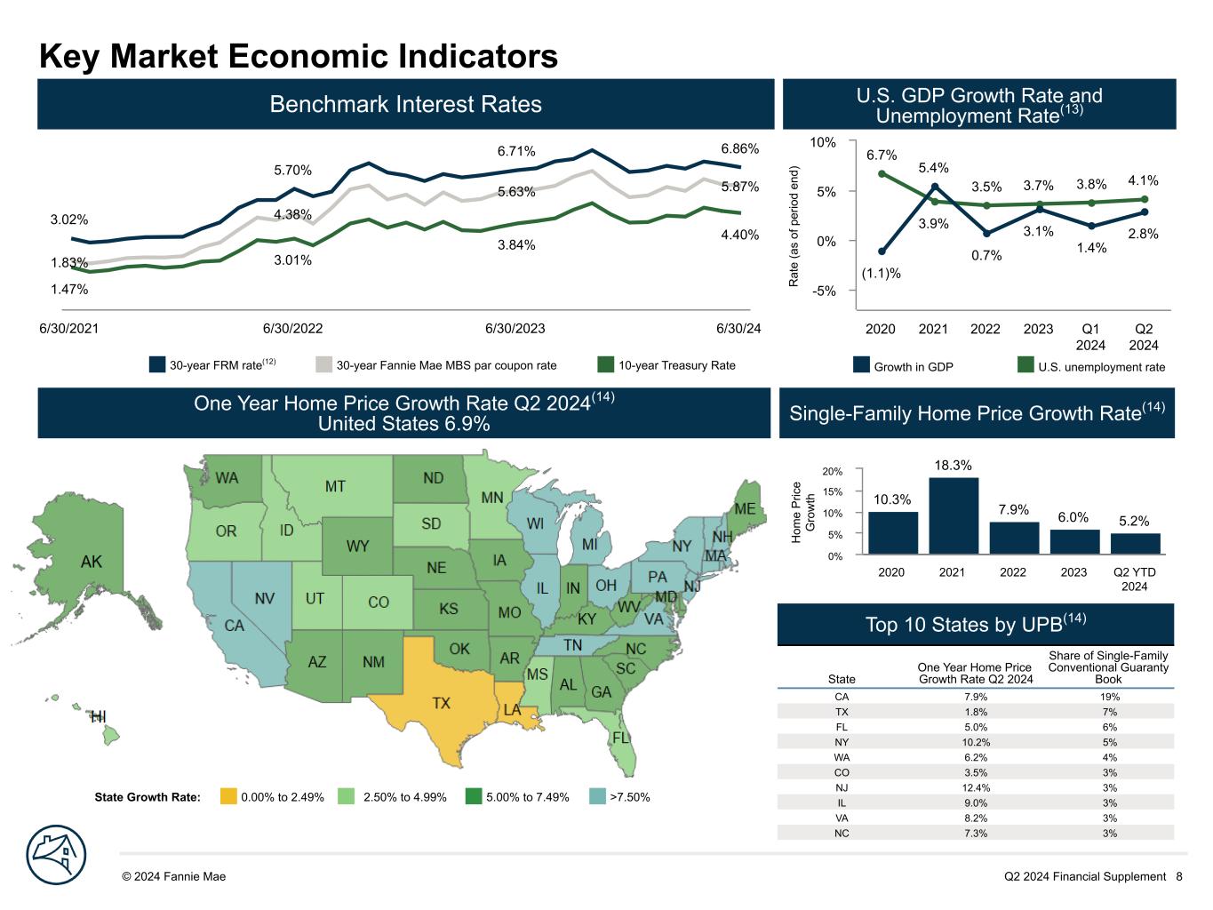 Q2 2024 Financial Supplement 8© 2024 Fannie Mae DRAFT State Growth Rate: 0.00% to 2.49% 2.50% to 4.99% 5.00% to 7.49% >7.50% 30-year FRM rate(12) 30-year Fannie Mae MBS par coupon rate 10-year Treasury Rate R at e (a s of p er io d en d) 6.7% 3.9% 3.5% 3.7% 3.8% 4.1% (1.1)% 5.4% 0.7% 3.1% 1.4% 2.8% 2020 2021 2022 2023 Q1 2024 Q2 2024 -5% 0% 5% 10% Key Market Economic Indicators 1.47% 3.01% 3.84% 4.40% 1.83% 4.38% 5.63% 5.87% 3.02% 5.70% 6.71% 6.86% 6/30/2021 6/30/2022 6/30/2023 6/30/24 Top 10 States by UPB(14) State One Year Home Price Growth Rate Q2 2024 Share of Single-Family Conventional Guaranty Book CA 7.9% 19% TX 1.8% 7% FL 5.0% 6% NY 10.2% 5% WA 6.2% 4% CO 3.5% 3% NJ 12.4% 3% IL 9.0% 3% VA 8.2% 3% NC 7.3% 3% H om e P ric e G ro w th 10.3% 18.3% 7.9% 6.0% 5.2% 2020 2021 2022 2023 Q2 YTD 2024 0% 5% 10% 15% 20% Benchmark Interest Rates U.S. GDP Growth Rate and Unemployment Rate(13) One Year Home Price Growth Rate Q2 2024(14) United States 6.9% Single-Family Home Price Growth Rate(14) Growth in GDP U.S. unemployment rate