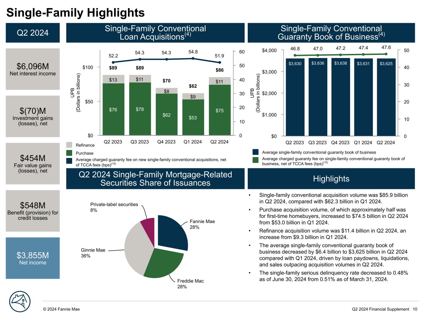 Q2 2024 Financial Supplement 10© 2024 Fannie Mae DRAFT Fannie Mae 28% Freddie Mac 28% Ginnie Mae 36% Private-label securities 8% U P B (D ol la rs in b illi on s) $3,630 $3,636 $3,638 $3,631 $3,625 46.8 47.0 47.2 47.4 47.6 Q2 2023 Q3 2023 Q4 2023 Q1 2024 Q2 2024 $0 $1,000 $2,000 $3,000 $4,000 0 10 20 30 40 50 U P B (D ol la rs in b illi on s) $76 $78 $62 $53 $75 $13 $11 $8 $9 $11 52.2 54.3 54.3 54.8 51.9 $89 $89 $70 $62 $86 Q2 2023 Q3 2023 Q4 2023 Q1 2024 Q2 2024 $0 $50 $100 0 10 20 30 40 50 60 Single-Family Highlights Q2 2024 $6,096M Net interest income $(70)M Investment gains (losses), net $454M Fair value gains (losses), net $548M Benefit (provision) for credit losses $3,855M Net income Single-Family Conventional Loan Acquisitions(4) Single-Family Conventional Guaranty Book of Business(4) Q2 2024 Single-Family Mortgage-Related Securities Share of Issuances Highlights Refinance Purchase Average charged guaranty fee on new single-family conventional acquisitions, net of TCCA fees (bps)(15) Average single-family conventional guaranty book of business Average charged guaranty fee on single-family conventional guaranty book of business, net of TCCA fees (bps)(15) • Single-family conventional acquisition volume was $85.9 billion in Q2 2024, compared with $62.3 billion in Q1 2024. • Purchase acquisition volume, of which approximately half was for first-time homebuyers, increased to $74.5 billion in Q2 2024 from $53.0 billion in Q1 2024. • Refinance acquisition volume was $11.4 billion in Q2 2024, an increase from $9.3 billion in Q1 2024. • The average single-family conventional guaranty book of business decreased by $6.4 billion to $3,625 billion in Q2 2024 compared with Q1 2024, driven by loan paydowns, liquidations, and sales outpacing acquisition volumes in Q2 2024. • The single-family serious delinquency rate decreased to 0.48% as of June 30, 2024 from 0.51% as of March 31, 2024.