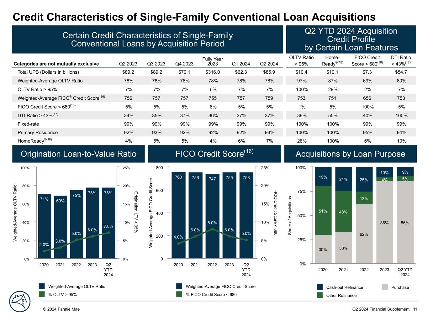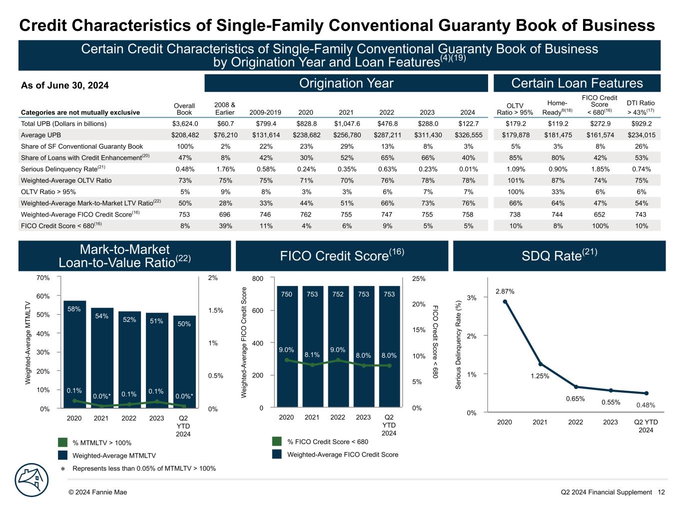 Q2 2024 Financial Supplement 11© 2024 Fannie Mae DRAFT S ha re o f A cq ui si tio ns 30% 33% 62% 86% 86% 51% 43% 13% 4% 5%19% 24% 25% 10% 9% 2020 2021 2022 2023 Q2 YTD 2024 0% 25% 50% 75% 100% W ei gh te d- Av er ag e FI C O C re di t S co re FIC O C redit S core < 680 760 756 747 755 758 4.0% 6.0% 8.0% 6.0% 5.0% 2020 2021 2022 2023 Q2 YTD 2024 0 200 400 600 800 0% 5% 10% 15% 20% 25% Credit Characteristics of Single-Family Conventional Loan Acquisitions Certain Credit Characteristics of Single-Family Conventional Loans by Acquisition Period Q2 YTD 2024 Acquisition Credit Profile by Certain Loan Features Categories are not mutually exclusive Q2 2023 Q3 2023 Q4 2023 Fully Year 2023 Q1 2024 Q2 2024 OLTV Ratio > 95% Home- Ready®(18) FICO Credit Score < 680(16) DTI Ratio > 43%(17) Total UPB (Dollars in billions) $89.2 $89.2 $70.1 $316.0 $62.3 $85.9 $10.4 $10.1 $7.3 $54.7 Weighted-Average OLTV Ratio 78% 78% 78% 78% 78% 78% 97% 87% 69% 80% OLTV Ratio > 95% 7% 7% 7% 6% 7% 7% 100% 29% 2% 7% Weighted-Average FICO® Credit Score(16) 756 757 757 755 757 759 753 751 656 753 FICO Credit Score < 680(16) 5% 5% 5% 6% 5% 5% 1% 5% 100% 5% DTI Ratio > 43%(17) 34% 35% 37% 36% 37% 37% 39% 55% 40% 100% Fixed-rate 99% 99% 99% 99% 99% 99% 100% 100% 99% 99% Primary Residence 92% 93% 92% 92% 92% 93% 100% 100% 95% 94% HomeReady®(18) 4% 5% 5% 4% 6% 7% 28% 100% 6% 10% W ei gh te d- Av er ag e O LT V R at io O rigination LTV > 95% 71% 69% 75% 78% 78% 2.0% 3.0% 5.0% 6.0% 7.0% 2020 2021 2022 2023 Q2 YTD 2024 0% 20% 40% 60% 80% 100% 0% 5% 10% 15% 20% 25% Origination Loan-to-Value Ratio FICO Credit Score(16) Acquisitions by Loan Purpose Weighted-Average OLTV Ratio % OLTV > 95% Weighted-Average FICO Credit Score % FICO Credit Score < 680 Cash-out Refinance Purchase Other Refinance