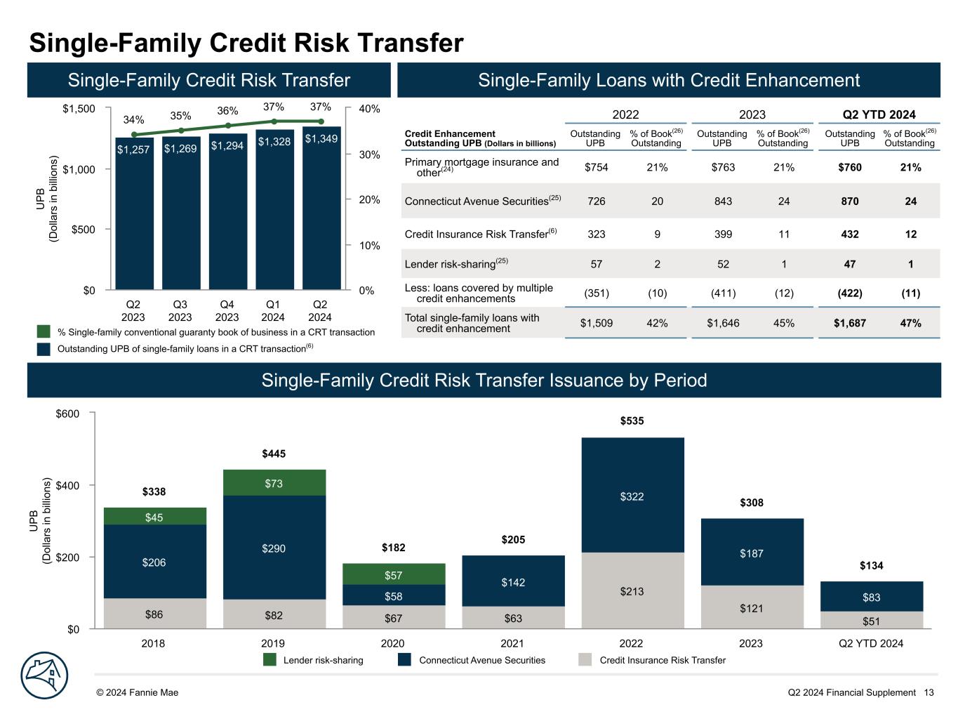 Q2 2024 Financial Supplement 13© 2024 Fannie Mae DRAFT U P B (D ol la rs in b illi on s) $86 $82 $67 $63 $213 $121 $51 $206 $290 $58 $142 $322 $187 $83 $45 $73 $57 $338 $445 $182 $205 $535 $308 $134 2018 2019 2020 2021 2022 2023 Q2 YTD 2024 $0 $200 $400 $600 Single-Family Credit Risk Transfer U P B (D ol la rs in b illi on s) $1,257 $1,269 $1,294 $1,328 $1,349 34% 35% 36% 37% 37% Q2 2023 Q3 2023 Q4 2023 Q1 2024 Q2 2024 $0 $500 $1,000 $1,500 0% 10% 20% 30% 40% 2022 2023 Q2 YTD 2024 Credit Enhancement Outstanding UPB (Dollars in billions) Outstanding UPB % of Book(26) Outstanding Outstanding UPB % of Book(26) Outstanding Outstanding UPB % of Book(26) Outstanding Primary mortgage insurance and other(24) $754 21% $763 21% $760 21% Connecticut Avenue Securities(25) 726 20 843 24 870 24 Credit Insurance Risk Transfer(6) 323 9 399 11 432 12 Lender risk-sharing(25) 57 2 52 1 47 1 Less: loans covered by multiple credit enhancements (351) (10) (411) (12) (422) (11) Total single-family loans with credit enhancement $1,509 42% $1,646 45% $1,687 47% Single-Family Credit Risk Transfer Issuance by Period Single-Family Credit Risk Transfer Single-Family Loans with Credit Enhancement % Single-family conventional guaranty book of business in a CRT transaction Outstanding UPB of single-family loans in a CRT transaction(6) Lender risk-sharing Connecticut Avenue Securities Credit Insurance Risk Transfer