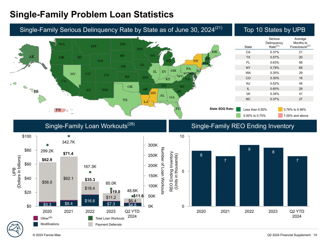 Q2 2024 Financial Supplement 14© 2024 Fannie Mae DRAFT U P B (D ol la rs in b illi on s) N um ber of Loan W orkouts $5.3 $8.4 $16.6 $7.3 $4.8 $56.0 $62.1 $18.4 $11.2 $6.4 299.2K 342.7K 167.3K 85.0K 48.6K 2020 2021 2022 2023 Q2 YTD 2024 $0 $20 $40 $60 $80 $100 0K 50K 100K 150K 200K 250K 300K R E O E nd in g In ve nt or y (U ni ts in th ou sa nd s) 8 7 9 8 7 2020 2021 2022 2023 Q2 YTD 2024 0 5 10 Single-Family Problem Loan Statistics State Serious Delinquency Rate(21) Average Months to Foreclosure(27) CA 0.37% 21 TX 0.57% 20 FL 0.63% 56 NY 0.79% 69 WA 0.35% 29 CO 0.30% 16 NJ 0.52% 45 IL 0.65% 29 VA 0.34% 41 NC 0.37% 27 Single-Family Serious Delinquency Rate by State as of June 30, 2024(21) Top 10 States by UPB Single-Family Loan Workouts(28) Single-Family REO Ending Inventory Less than 0.50% 0.76% to 0.99% 0.50% to 0.75% 1.00% and above Other(29) Total Loan Workouts Modifications Payment Deferrals $35.3 $71.4 $62.9 $19.0 $11.6 State SDQ Rate: