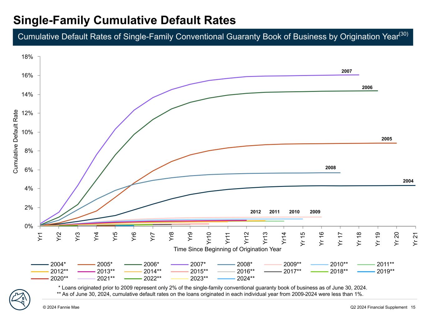 Q2 2024 Financial Supplement 15© 2024 Fannie Mae DRAFT Time Since Beginning of Origination Year C um ul at iv e D ef au lt R at e 2004* 2005* 2006* 2007* 2008* 2009** 2010** 2011** 2012** 2013** 2014** 2015** 2016** 2017** 2018** 2019** 2020** 2021** 2022** 2023** 2024** Y r1 Y r2 Y r3 Y r4 Y r5 Y r6 Y r7 Y r8 Y r9 Y r1 0 Y r1 1 Y r1 2 Y r1 3 Y r1 4 Y r 1 5 Y r 1 6 Y r 1 7 Y r 1 8 Y r 1 9 Y r 2 0 Y r 2 1 0% 2% 4% 6% 8% 10% 12% 14% 16% 18% Single-Family Cumulative Default Rates Cumulative Default Rates of Single-Family Conventional Guaranty Book of Business by Origination Year(30) * Loans originated prior to 2009 represent only 2% of the single-family conventional guaranty book of business as of June 30, 2024. ** As of June 30, 2024, cumulative default rates on the loans originated in each individual year from 2009-2024 were less than 1%. 2007 2009 2006 201020112012 2004 2008 2005