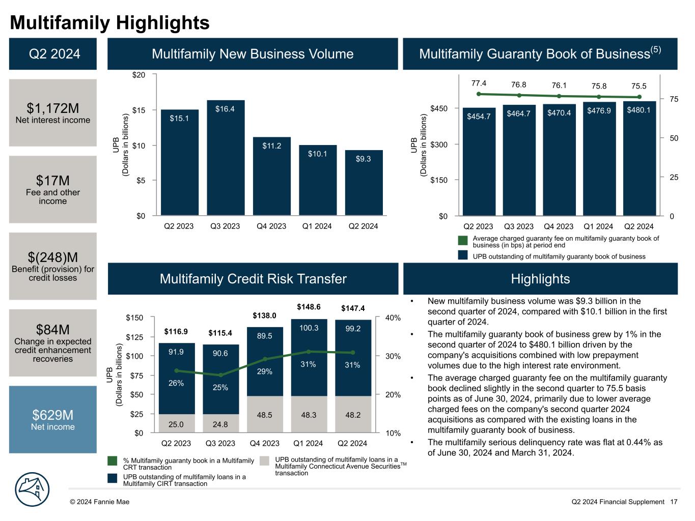 Q2 2024 Financial Supplement 17© 2024 Fannie Mae DRAFT U P B (D ol la rs in b illi on s) $454.7 $464.7 $470.4 $476.9 $480.1 77.4 76.8 76.1 75.8 75.5 Q2 2023 Q3 2023 Q4 2023 Q1 2024 Q2 2024 $0 $150 $300 $450 0 25 50 75 U P B (D ol la rs in b illi on s) $15.1 $16.4 $11.2 $10.1 $9.3 Q2 2023 Q3 2023 Q4 2023 Q1 2024 Q2 2024 $0 $5 $10 $15 $20 Multifamily Highlights Q2 2024 $1,172M Net interest income $17M Fee and other income $(248)M Benefit (provision) for credit losses $84M Change in expected credit enhancement recoveries $629M Net income Multifamily New Business Volume Multifamily Guaranty Book of Business(5) Multifamily Credit Risk Transfer Highlights U P B (D ol la rs in b illi on s) 25.0 24.8 48.5 48.3 48.2 91.9 90.6 89.5 100.3 99.2 26% 25% 29% 31% 31% $116.9 $115.4 $138.0 $148.6 $147.4 Q2 2023 Q3 2023 Q4 2023 Q1 2024 Q2 2024 $0 $25 $50 $75 $100 $125 $150 10% 20% 30% 40% Average charged guaranty fee on multifamily guaranty book of business (in bps) at period end UPB outstanding of multifamily guaranty book of business UPB outstanding of multifamily loans in a Multifamily Connecticut Avenue SecuritiesTM transaction % Multifamily guaranty book in a Multifamily CRT transaction UPB outstanding of multifamily loans in a Multifamily CIRT transaction • New multifamily business volume was $9.3 billion in the second quarter of 2024, compared with $10.1 billion in the first quarter of 2024. • The multifamily guaranty book of business grew by 1% in the second quarter of 2024 to $480.1 billion driven by the company's acquisitions combined with low prepayment volumes due to the high interest rate environment. • The average charged guaranty fee on the multifamily guaranty book declined slightly in the second quarter to 75.5 basis points as of June 30, 2024, primarily due to lower average charged fees on the company's second quarter 2024 acquisitions as compared with the existing loans in the multifamily guaranty book of business. • The multifamily serious delinquency rate was flat at 0.44% as of June 30, 2024 and March 31, 2024.
