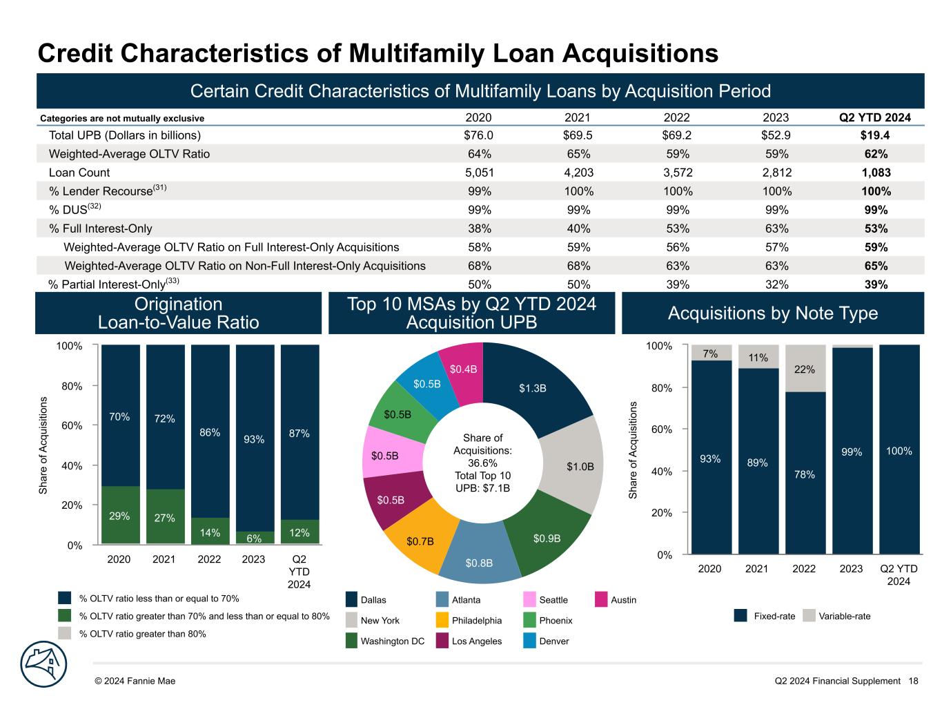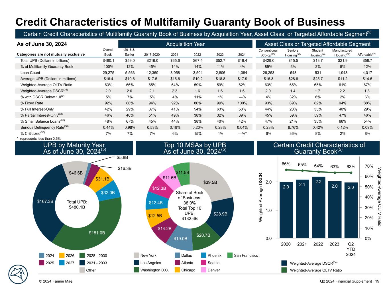 Q2 2024 Financial Supplement 18© 2024 Fannie Mae DRAFT S ha re o f A cq ui si tio ns 93% 89% 78% 99% 100% 7% 11% 22% 2020 2021 2022 2023 Q2 YTD 2024 0% 20% 40% 60% 80% 100% Credit Characteristics of Multifamily Loan Acquisitions Certain Credit Characteristics of Multifamily Loans by Acquisition Period Categories are not mutually exclusive 2020 2021 2022 2023 Q2 YTD 2024 Total UPB (Dollars in billions) $76.0 $69.5 $69.2 $52.9 $19.4 Weighted-Average OLTV Ratio 64% 65% 59% 59% 62% Loan Count 5,051 4,203 3,572 2,812 1,083 % Lender Recourse(31) 99% 100% 100% 100% 100% % DUS(32) 99% 99% 99% 99% 99% % Full Interest-Only 38% 40% 53% 63% 53% Weighted-Average OLTV Ratio on Full Interest-Only Acquisitions 58% 59% 56% 57% 59% Weighted-Average OLTV Ratio on Non-Full Interest-Only Acquisitions 68% 68% 63% 63% 65% % Partial Interest-Only(33) 50% 50% 39% 32% 39% S ha re o f A cq ui si tio ns 29% 27% 14% 6% 12% 70% 72% 86% 93% 87% 2020 2021 2022 2023 Q2 YTD 2024 0% 20% 40% 60% 80% 100% $1.3B $1.0B $0.9B $0.8B $0.7B $0.5B $0.5B $0.5B $0.5B $0.4B Share of Acquisitions: 36.6% Total Top 10 UPB: $7.1B Origination Loan-to-Value Ratio Top 10 MSAs by Q2 YTD 2024 Acquisition UPB Acquisitions by Note Type % OLTV ratio less than or equal to 70% % OLTV ratio greater than 70% and less than or equal to 80% % OLTV ratio greater than 80% Fixed-rate Variable-rate Dallas Atlanta Seattle Austin New York Philadelphia Phoenix Washington DC Los Angeles Denver