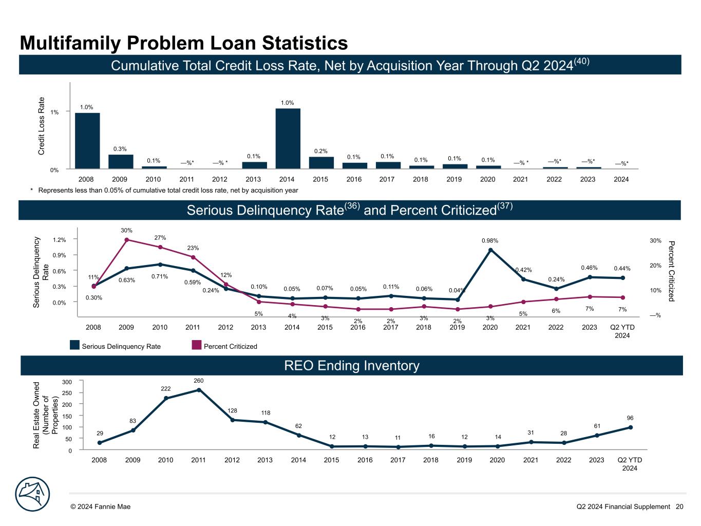 Q2 2024 Financial Supplement 20© 2024 Fannie Mae DRAFT S er io us D el in qu en cy R at e P ercent C riticized0.30% 0.63% 0.71% 0.59% 0.24% 0.10% 0.05% 0.07% 0.05% 0.11% 0.06% 0.04% 0.98% 0.42% 0.24% 0.46% 0.44% 11% 30% 27% 23% 12% 5% 4% 3% 2% 2% 3% 2% 3% 5% 6% 7% 7% 2008 2009 2010 2011 2012 2013 2014 2015 2016 2017 2018 2019 2020 2021 2022 2023 Q2 YTD 2024 0.0% 0.3% 0.6% 0.9% 1.2% —% 10% 20% 30% Multifamily Problem Loan Statistics C re di t L os s R at e 1.0% 0.3% 0.1% —%* —% * 0.1% 1.0% 0.2% 0.1% 0.1% 0.1% 0.1% 0.1% —% * —%* —%* —%* 2008 2009 2010 2011 2012 2013 2014 2015 2016 2017 2018 2019 2020 2021 2022 2023 2024 0% 1% Serious Delinquency Rate(36) and Percent Criticized(37) Cumulative Total Credit Loss Rate, Net by Acquisition Year Through Q2 2024(40) * Represents less than 0.05% of cumulative total credit loss rate, net by acquisition year R ea l E st at e O w ne d (N um be r o f P ro pe rti es ) 29 83 222 260 128 118 62 12 13 11 16 12 14 31 28 61 96 2008 2009 2010 2011 2012 2013 2014 2015 2016 2017 2018 2019 2020 2021 2022 2023 Q2 YTD 2024 0 50 100 150 200 250 300 REO Ending Inventory Serious Delinquency Rate Percent Criticized
