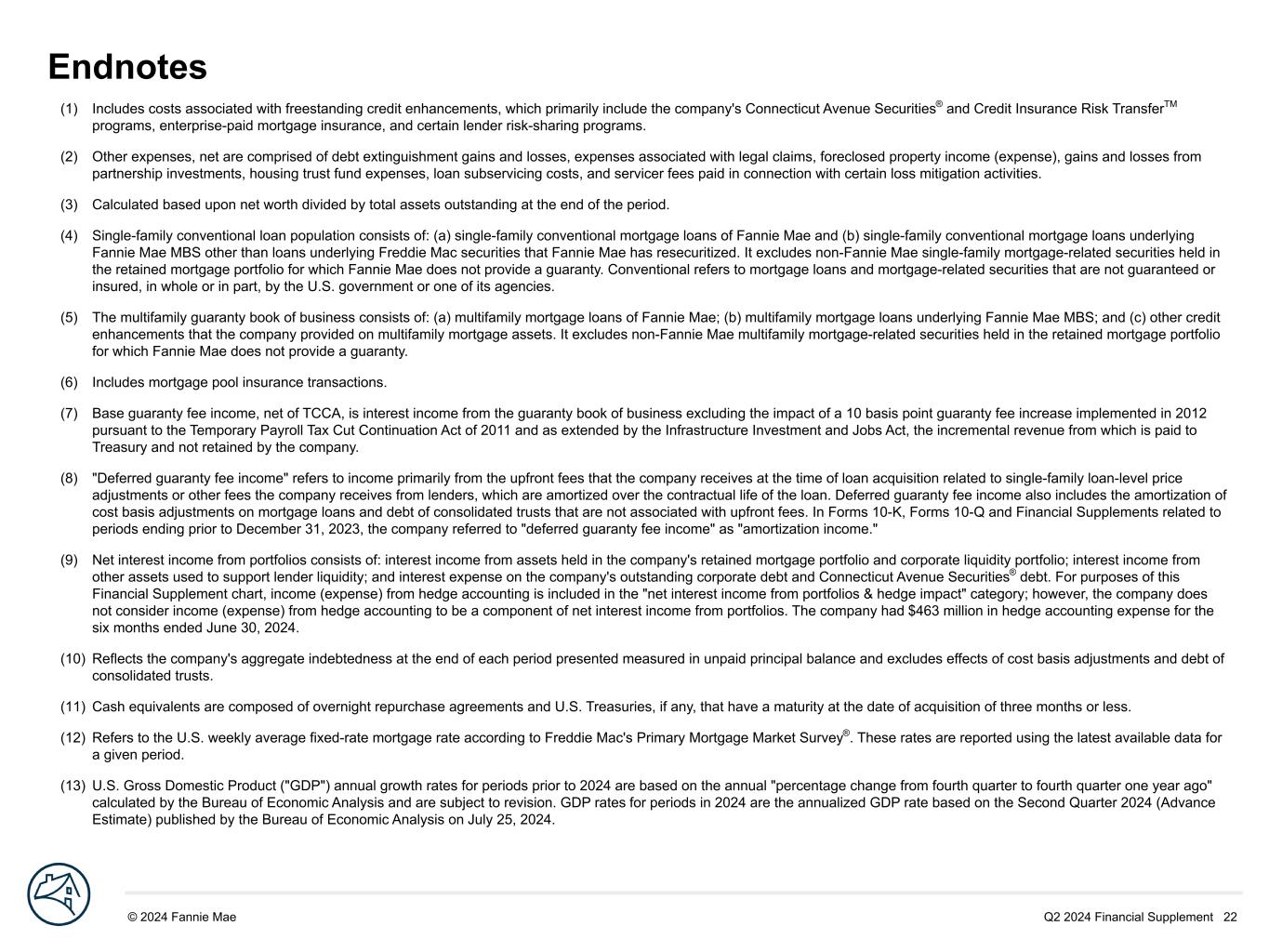 Q2 2024 Financial Supplement 22© 2024 Fannie Mae DRAFT (1) Includes costs associated with freestanding credit enhancements, which primarily include the company's Connecticut Avenue Securities® and Credit Insurance Risk TransferTM programs, enterprise-paid mortgage insurance, and certain lender risk-sharing programs. (2) Other expenses, net are comprised of debt extinguishment gains and losses, expenses associated with legal claims, foreclosed property income (expense), gains and losses from partnership investments, housing trust fund expenses, loan subservicing costs, and servicer fees paid in connection with certain loss mitigation activities. (3) Calculated based upon net worth divided by total assets outstanding at the end of the period. (4) Single-family conventional loan population consists of: (a) single-family conventional mortgage loans of Fannie Mae and (b) single-family conventional mortgage loans underlying Fannie Mae MBS other than loans underlying Freddie Mac securities that Fannie Mae has resecuritized. It excludes non-Fannie Mae single-family mortgage-related securities held in the retained mortgage portfolio for which Fannie Mae does not provide a guaranty. Conventional refers to mortgage loans and mortgage-related securities that are not guaranteed or insured, in whole or in part, by the U.S. government or one of its agencies. (5) The multifamily guaranty book of business consists of: (a) multifamily mortgage loans of Fannie Mae; (b) multifamily mortgage loans underlying Fannie Mae MBS; and (c) other credit enhancements that the company provided on multifamily mortgage assets. It excludes non-Fannie Mae multifamily mortgage-related securities held in the retained mortgage portfolio for which Fannie Mae does not provide a guaranty. (6) Includes mortgage pool insurance transactions. (7) Base guaranty fee income, net of TCCA, is interest income from the guaranty book of business excluding the impact of a 10 basis point guaranty fee increase implemented in 2012 pursuant to the Temporary Payroll Tax Cut Continuation Act of 2011 and as extended by the Infrastructure Investment and Jobs Act, the incremental revenue from which is paid to Treasury and not retained by the company. (8) "Deferred guaranty fee income" refers to income primarily from the upfront fees that the company receives at the time of loan acquisition related to single-family loan-level price adjustments or other fees the company receives from lenders, which are amortized over the contractual life of the loan. Deferred guaranty fee income also includes the amortization of cost basis adjustments on mortgage loans and debt of consolidated trusts that are not associated with upfront fees. In Forms 10-K, Forms 10-Q and Financial Supplements related to periods ending prior to December 31, 2023, the company referred to "deferred guaranty fee income" as "amortization income." (9) Net interest income from portfolios consists of: interest income from assets held in the company's retained mortgage portfolio and corporate liquidity portfolio; interest income from other assets used to support lender liquidity; and interest expense on the company's outstanding corporate debt and Connecticut Avenue Securities® debt. For purposes of this Financial Supplement chart, income (expense) from hedge accounting is included in the "net interest income from portfolios & hedge impact" category; however, the company does not consider income (expense) from hedge accounting to be a component of net interest income from portfolios. The company had $463 million in hedge accounting expense for the six months ended June 30, 2024. (10) Reflects the company's aggregate indebtedness at the end of each period presented measured in unpaid principal balance and excludes effects of cost basis adjustments and debt of consolidated trusts. (11) Cash equivalents are composed of overnight repurchase agreements and U.S. Treasuries, if any, that have a maturity at the date of acquisition of three months or less. (12) Refers to the U.S. weekly average fixed-rate mortgage rate according to Freddie Mac's Primary Mortgage Market Survey®. These rates are reported using the latest available data for a given period. (13) U.S. Gross Domestic Product ("GDP") annual growth rates for periods prior to 2024 are based on the annual "percentage change from fourth quarter to fourth quarter one year ago" calculated by the Bureau of Economic Analysis and are subject to revision. GDP rates for periods in 2024 are the annualized GDP rate based on the Second Quarter 2024 (Advance Estimate) published by the Bureau of Economic Analysis on July 25, 2024. Endnotes
