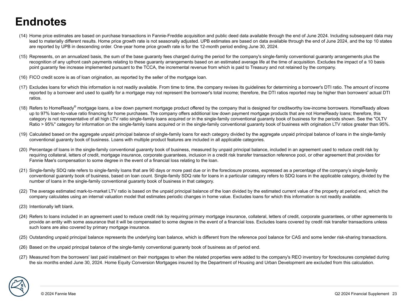 Q2 2024 Financial Supplement 23© 2024 Fannie Mae DRAFT Endnotes (14) Home price estimates are based on purchase transactions in Fannie-Freddie acquisition and public deed data available through the end of June 2024. Including subsequent data may lead to materially different results. Home price growth rate is not seasonally adjusted. UPB estimates are based on data available through the end of June 2024, and the top 10 states are reported by UPB in descending order. One-year home price growth rate is for the 12-month period ending June 30, 2024. (15) Represents, on an annualized basis, the sum of the base guaranty fees charged during the period for the company's single-family conventional guaranty arrangements plus the recognition of any upfront cash payments relating to these guaranty arrangements based on an estimated average life at the time of acquisition. Excludes the impact of a 10 basis point guaranty fee increase implemented pursuant to the TCCA, the incremental revenue from which is paid to Treasury and not retained by the company. (16) FICO credit score is as of loan origination, as reported by the seller of the mortgage loan. (17) Excludes loans for which this information is not readily available. From time to time, the company revises its guidelines for determining a borrower's DTI ratio. The amount of income reported by a borrower and used to qualify for a mortgage may not represent the borrower's total income; therefore, the DTI ratios reported may be higher than borrowers' actual DTI ratios. (18) Refers to HomeReady® mortgage loans, a low down payment mortgage product offered by the company that is designed for creditworthy low-income borrowers. HomeReady allows up to 97% loan-to-value ratio financing for home purchases. The company offers additional low down payment mortgage products that are not HomeReady loans; therefore, this category is not representative of all high LTV ratio single-family loans acquired or in the single-family conventional guaranty book of business for the periods shown. See the "OLTV Ratio > 95%" category for information on the single-family loans acquired or in the single-family conventional guaranty book of business with origination LTV ratios greater than 95%. (19) Calculated based on the aggregate unpaid principal balance of single-family loans for each category divided by the aggregate unpaid principal balance of loans in the single-family conventional guaranty book of business. Loans with multiple product features are included in all applicable categories. (20) Percentage of loans in the single-family conventional guaranty book of business, measured by unpaid principal balance, included in an agreement used to reduce credit risk by requiring collateral, letters of credit, mortgage insurance, corporate guarantees, inclusion in a credit risk transfer transaction reference pool, or other agreement that provides for Fannie Mae's compensation to some degree in the event of a financial loss relating to the loan. (21) Single-family SDQ rate refers to single-family loans that are 90 days or more past due or in the foreclosure process, expressed as a percentage of the company’s single-family conventional guaranty book of business, based on loan count. Single-family SDQ rate for loans in a particular category refers to SDQ loans in the applicable category, divided by the number of loans in the single-family conventional guaranty book of business in that category. (22) The average estimated mark-to-market LTV ratio is based on the unpaid principal balance of the loan divided by the estimated current value of the property at period end, which the company calculates using an internal valuation model that estimates periodic changes in home value. Excludes loans for which this information is not readily available. (23) Intentionally left blank. (24) Refers to loans included in an agreement used to reduce credit risk by requiring primary mortgage insurance, collateral, letters of credit, corporate guarantees, or other agreements to provide an entity with some assurance that it will be compensated to some degree in the event of a financial loss. Excludes loans covered by credit risk transfer transactions unless such loans are also covered by primary mortgage insurance. (25) Outstanding unpaid principal balance represents the underlying loan balance, which is different from the reference pool balance for CAS and some lender risk-sharing transactions. (26) Based on the unpaid principal balance of the single-family conventional guaranty book of business as of period end. (27) Measured from the borrowers' last paid installment on their mortgages to when the related properties were added to the company's REO inventory for foreclosures completed during the six months ended June 30, 2024. Home Equity Conversion Mortgages insured by the Department of Housing and Urban Development are excluded from this calculation.