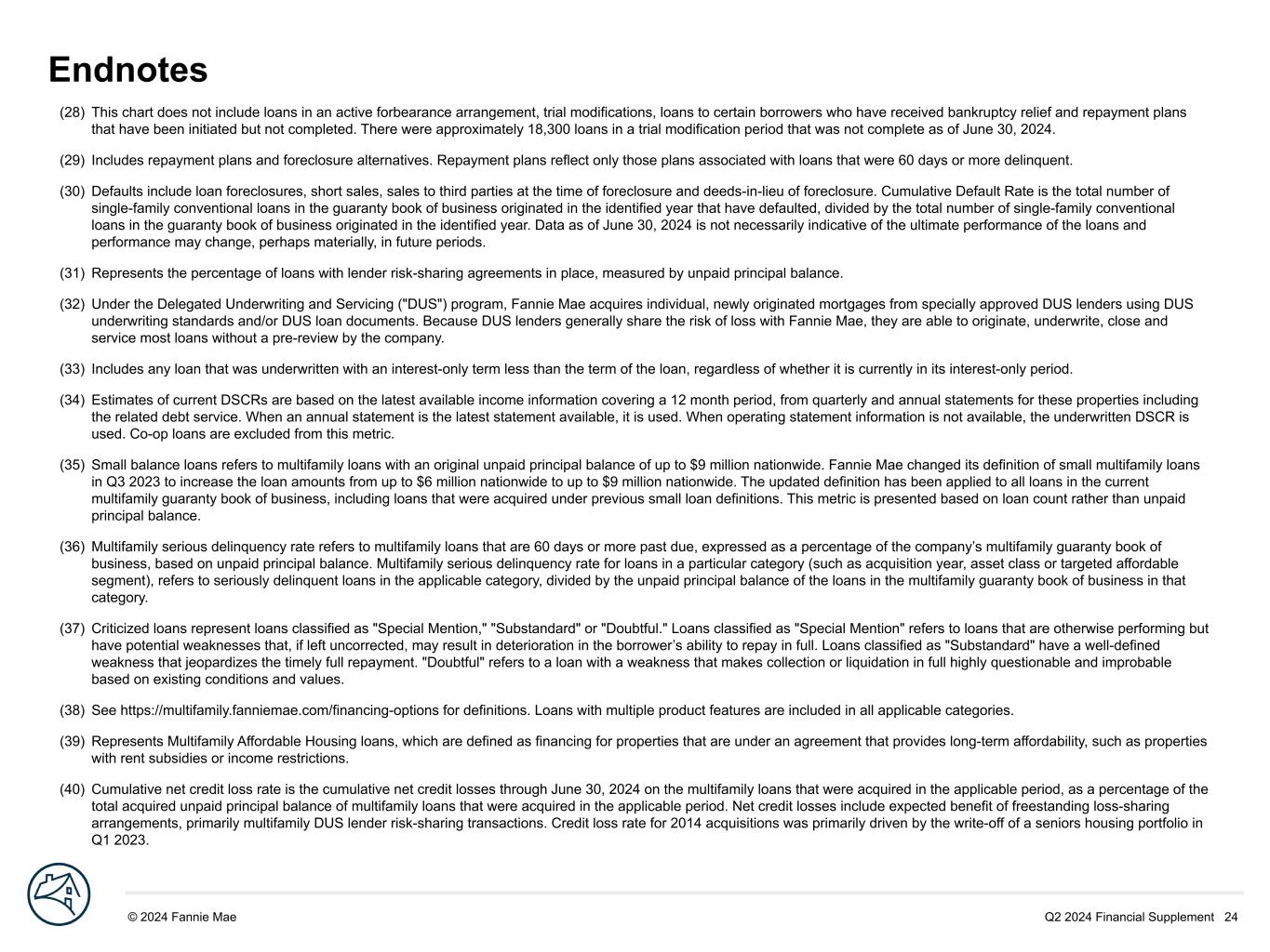 Q2 2024 Financial Supplement 24© 2024 Fannie Mae DRAFT (28) This chart does not include loans in an active forbearance arrangement, trial modifications, loans to certain borrowers who have received bankruptcy relief and repayment plans that have been initiated but not completed. There were approximately 18,300 loans in a trial modification period that was not complete as of June 30, 2024. (29) Includes repayment plans and foreclosure alternatives. Repayment plans reflect only those plans associated with loans that were 60 days or more delinquent. (30) Defaults include loan foreclosures, short sales, sales to third parties at the time of foreclosure and deeds-in-lieu of foreclosure. Cumulative Default Rate is the total number of single-family conventional loans in the guaranty book of business originated in the identified year that have defaulted, divided by the total number of single-family conventional loans in the guaranty book of business originated in the identified year. Data as of June 30, 2024 is not necessarily indicative of the ultimate performance of the loans and performance may change, perhaps materially, in future periods. (31) Represents the percentage of loans with lender risk-sharing agreements in place, measured by unpaid principal balance. (32) Under the Delegated Underwriting and Servicing ("DUS") program, Fannie Mae acquires individual, newly originated mortgages from specially approved DUS lenders using DUS underwriting standards and/or DUS loan documents. Because DUS lenders generally share the risk of loss with Fannie Mae, they are able to originate, underwrite, close and service most loans without a pre-review by the company. (33) Includes any loan that was underwritten with an interest-only term less than the term of the loan, regardless of whether it is currently in its interest-only period. (34) Estimates of current DSCRs are based on the latest available income information covering a 12 month period, from quarterly and annual statements for these properties including the related debt service. When an annual statement is the latest statement available, it is used. When operating statement information is not available, the underwritten DSCR is used. Co-op loans are excluded from this metric. (35) Small balance loans refers to multifamily loans with an original unpaid principal balance of up to $9 million nationwide. Fannie Mae changed its definition of small multifamily loans in Q3 2023 to increase the loan amounts from up to $6 million nationwide to up to $9 million nationwide. The updated definition has been applied to all loans in the current multifamily guaranty book of business, including loans that were acquired under previous small loan definitions. This metric is presented based on loan count rather than unpaid principal balance. (36) Multifamily serious delinquency rate refers to multifamily loans that are 60 days or more past due, expressed as a percentage of the company’s multifamily guaranty book of business, based on unpaid principal balance. Multifamily serious delinquency rate for loans in a particular category (such as acquisition year, asset class or targeted affordable segment), refers to seriously delinquent loans in the applicable category, divided by the unpaid principal balance of the loans in the multifamily guaranty book of business in that category. (37) Criticized loans represent loans classified as "Special Mention," "Substandard" or "Doubtful." Loans classified as "Special Mention" refers to loans that are otherwise performing but have potential weaknesses that, if left uncorrected, may result in deterioration in the borrower’s ability to repay in full. Loans classified as "Substandard" have a well-defined weakness that jeopardizes the timely full repayment. "Doubtful" refers to a loan with a weakness that makes collection or liquidation in full highly questionable and improbable based on existing conditions and values. (38) See https://multifamily.fanniemae.com/financing-options for definitions. Loans with multiple product features are included in all applicable categories. (39) Represents Multifamily Affordable Housing loans, which are defined as financing for properties that are under an agreement that provides long-term affordability, such as properties with rent subsidies or income restrictions. (40) Cumulative net credit loss rate is the cumulative net credit losses through June 30, 2024 on the multifamily loans that were acquired in the applicable period, as a percentage of the total acquired unpaid principal balance of multifamily loans that were acquired in the applicable period. Net credit losses include expected benefit of freestanding loss-sharing arrangements, primarily multifamily DUS lender risk-sharing transactions. Credit loss rate for 2014 acquisitions was primarily driven by the write-off of a seniors housing portfolio in Q1 2023. Endnotes