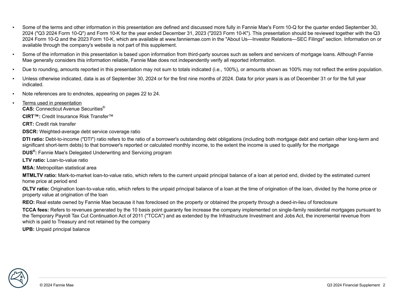 Q3 2024 Financial Supplement 2© 2024 Fannie Mae DRAFT ▪ Some of the terms and other information in this presentation are defined and discussed more fully in Fannie Mae's Form 10-Q for the quarter ended September 30, 2024 ("Q3 2024 Form 10-Q") and Form 10-K for the year ended December 31, 2023 ("2023 Form 10-K"). This presentation should be reviewed together with the Q3 2024 Form 10-Q and the 2023 Form 10-K, which are available at www.fanniemae.com in the "About Us—Investor Relations—SEC Filings" section. Information on or available through the company's website is not part of this supplement. ▪ Some of the information in this presentation is based upon information from third-party sources such as sellers and servicers of mortgage loans. Although Fannie Mae generally considers this information reliable, Fannie Mae does not independently verify all reported information. ▪ Due to rounding, amounts reported in this presentation may not sum to totals indicated (i.e., 100%), or amounts shown as 100% may not reflect the entire population. ▪ Unless otherwise indicated, data is as of September 30, 2024 or for the first nine months of 2024. Data for prior years is as of December 31 or for the full year indicated. ▪ Note references are to endnotes, appearing on pages 22 to 24. ▪ Terms used in presentation CAS: Connecticut Avenue Securities® CIRT™: Credit Insurance Risk Transfer™ CRT: Credit risk transfer DSCR: Weighted-average debt service coverage ratio DTI ratio: Debt-to-income ("DTI") ratio refers to the ratio of a borrower's outstanding debt obligations (including both mortgage debt and certain other long-term and significant short-term debts) to that borrower's reported or calculated monthly income, to the extent the income is used to qualify for the mortgage DUS®: Fannie Mae's Delegated Underwriting and Servicing program LTV ratio: Loan-to-value ratio MSA: Metropolitan statistical area MTMLTV ratio: Mark-to-market loan-to-value ratio, which refers to the current unpaid principal balance of a loan at period end, divided by the estimated current home price at period end OLTV ratio: Origination loan-to-value ratio, which refers to the unpaid principal balance of a loan at the time of origination of the loan, divided by the home price or property value at origination of the loan REO: Real estate owned by Fannie Mae because it has foreclosed on the property or obtained the property through a deed-in-lieu of foreclosure TCCA fees: Refers to revenues generated by the 10 basis point guaranty fee increase the company implemented on single-family residential mortgages pursuant to the Temporary Payroll Tax Cut Continuation Act of 2011 ("TCCA") and as extended by the Infrastructure Investment and Jobs Act, the incremental revenue from which is paid to Treasury and not retained by the company UPB: Unpaid principal balance