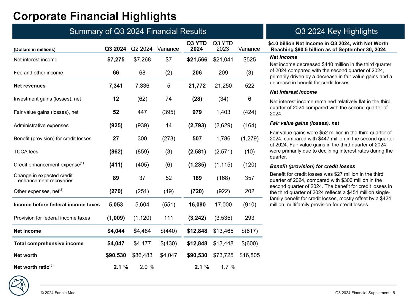 Q3 2024 Financial Supplement 5© 2024 Fannie Mae DRAFTCorporate Financial Highlights (Dollars in millions) Q3 2024 Q2 2024 Variance Q3 YTD 2024 Q3 YTD 2023 Variance Net interest income $7,275 $7,268 $7 $21,566 $21,041 $525 Fee and other income 66 68 (2) 206 209 (3) Net revenues 7,341 7,336 5 21,772 21,250 522 Investment gains (losses), net 12 (62) 74 (28) (34) 6 Fair value gains (losses), net 52 447 (395) 979 1,403 (424) Administrative expenses (925) (939) 14 (2,793) (2,629) (164) Benefit (provision) for credit losses 27 300 (273) 507 1,786 (1,279) TCCA fees (862) (859) (3) (2,581) (2,571) (10) Credit enhancement expense(1) (411) (405) (6) (1,235) (1,115) (120) Change in expected credit enhancement recoveries 89 37 52 189 (168) 357 Other expenses, net(2) (270) (251) (19) (720) (922) 202 Income before federal income taxes 5,053 5,604 (551) 16,090 17,000 (910) Provision for federal income taxes (1,009) (1,120) 111 (3,242) (3,535) 293 Net income $4,044 $4,484 $(440) $12,848 $13,465 $(617) Total comprehensive income $4,047 $4,477 $(430) $12,848 $13,448 $(600) Net worth $90,530 $86,483 $4,047 $90,530 $73,725 $16,805 Net worth ratio(3) 2.1 % 2.0 % 2.1 % 1.7 % Summary of Q3 2024 Financial Results Q3 2024 Key Highlights $4.0 billion Net Income in Q3 2024, with Net Worth Reaching $90.5 billion as of September 30, 2024 Net income Net income decreased $440 million in the third quarter of 2024 compared with the second quarter of 2024, primarily driven by a decrease in fair value gains and a decrease in benefit for credit losses. Net interest income Net interest income remained relatively flat in the third quarter of 2024 compared with the second quarter of 2024. Fair value gains (losses), net Fair value gains were $52 million in the third quarter of 2024, compared with $447 million in the second quarter of 2024. Fair value gains in the third quarter of 2024 were primarily due to declining interest rates during the quarter. Benefit (provision) for credit losses Benefit for credit losses was $27 million in the third quarter of 2024, compared with $300 million in the second quarter of 2024. The benefit for credit losses in the third quarter of 2024 reflects a $451 million single- family benefit for credit losses, mostly offset by a $424 million multifamily provision for credit losses.
