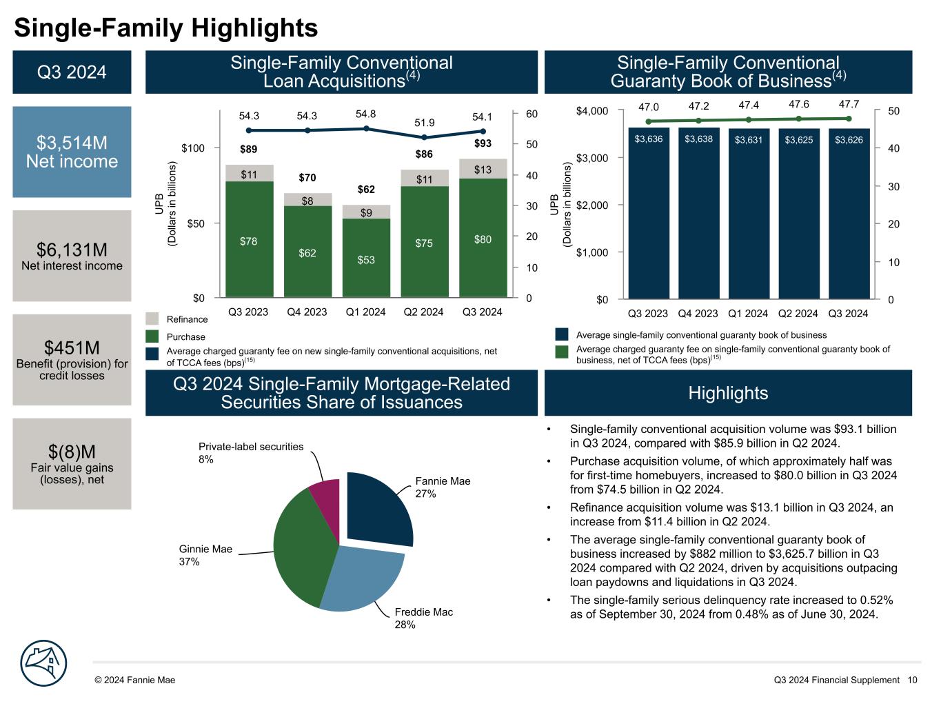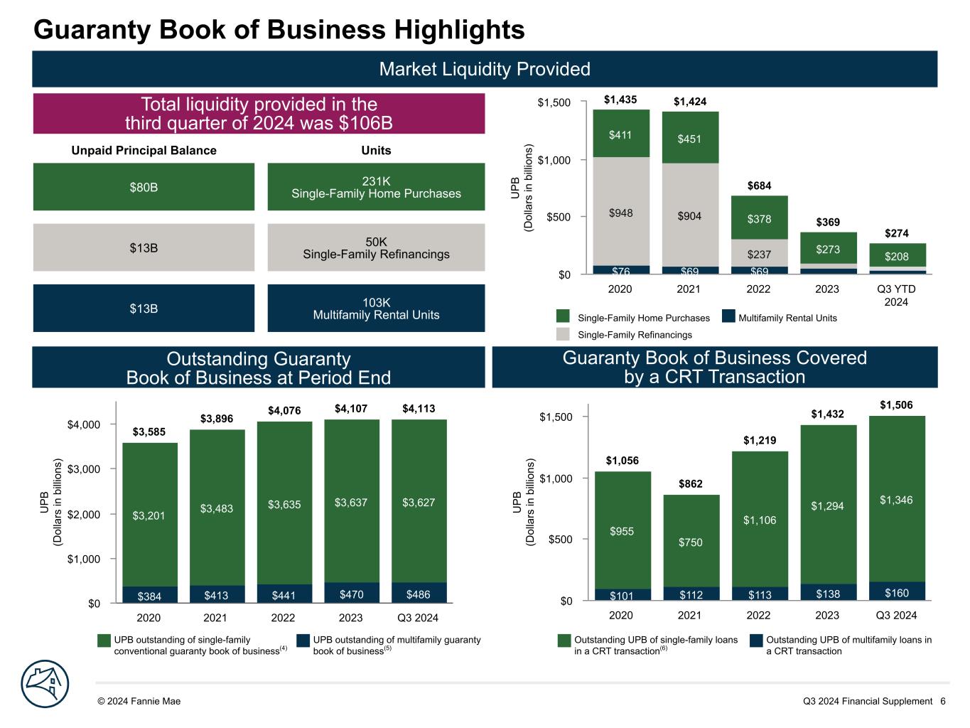 Q3 2024 Financial Supplement 3© 2024 Fannie Mae DRAFTTable of Contents Overview Corporate Financial Highlights 5 Guaranty Book of Business Highlights 6 Interest Income and Liquidity Management 7 Key Market Economic Indicators 8 Single-Family Business Single-Family Highlights 10 Credit Characteristics of Single-Family Conventional Loan Acquisitions 11 Credit Characteristics of Single-Family Conventional Guaranty Book of Business 12 Single-Family Credit Risk Transfer 13 Single-Family Problem Loan Statistics 14 Single-Family Cumulative Default Rates 15 Multifamily Business Multifamily Highlights 17 Credit Characteristics of Multifamily Loan Acquisitions 18 Credit Characteristics of Multifamily Guaranty Book of Business 19 Multifamily Problem Loan Statistics 20 Endnotes Endnotes 22