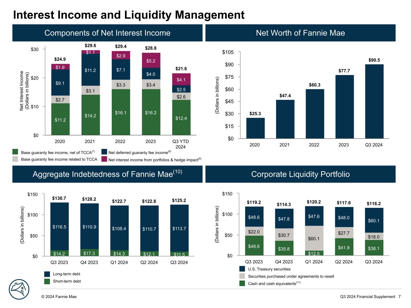 Q3 2024 Financial Supplement 7© 2024 Fannie Mae DRAFTInterest Income and Liquidity Management Components of Net Interest Income Net Worth of Fannie Mae Aggregate Indebtedness of Fannie Mae(10) Corporate Liquidity Portfolio N et In te re st In co m e (D ol la rs in b illi on s) $24.9 $29.6 $29.4 $28.8 $21.6 $11.2 $14.2 $16.1 $16.2 $12.4 $2.7 $3.1 $3.3 $3.4 $2.6 $9.1 $11.2 $7.1 $4.0 $2.5 $1.9 $1.1 $2.9 $5.2 $4.1 2020 2021 2022 2023 Q3 YTD 2024 $0 $10 $20 $30 Base guaranty fee income, net of TCCA(7) Net deferred guaranty fee income(8) Base guaranty fee income related to TCCA Net interest income from portfolios & hedge impact(9) (D ol la rs in b illi on s) $14.2 $17.3 $14.3 $12.1 $11.5 $116.5 $110.9 $108.4 $110.7 $113.7 $130.7 $128.2 $122.7 $122.8 $125.2 Q3 2023 Q4 2023 Q1 2024 Q2 2024 Q3 2024 $0 $50 $100 $150 (D ol la rs in b illi on s) $48.6 $35.8 $12.5 $41.9 $38.1 $22.0 $30.7 $60.1 $27.7 $18.0 $48.6 $47.8 $47.6 $48.0 $60.1 $119.2 $114.3 $120.2 $117.6 $116.2 Q3 2023 Q4 2023 Q1 2024 Q2 2024 Q3 2024 $0 $50 $100 $150 U.S. Treasury securities Securities purchased under agreements to resell Cash and cash equivalents(11) Long-term debt Short-term debt (D ol la rs in b illi on s) $25.3 $47.4 $60.3 $77.7 $90.5 2020 2021 2022 2023 Q3 2024 $0 $15 $30 $45 $60 $75 $90 $105