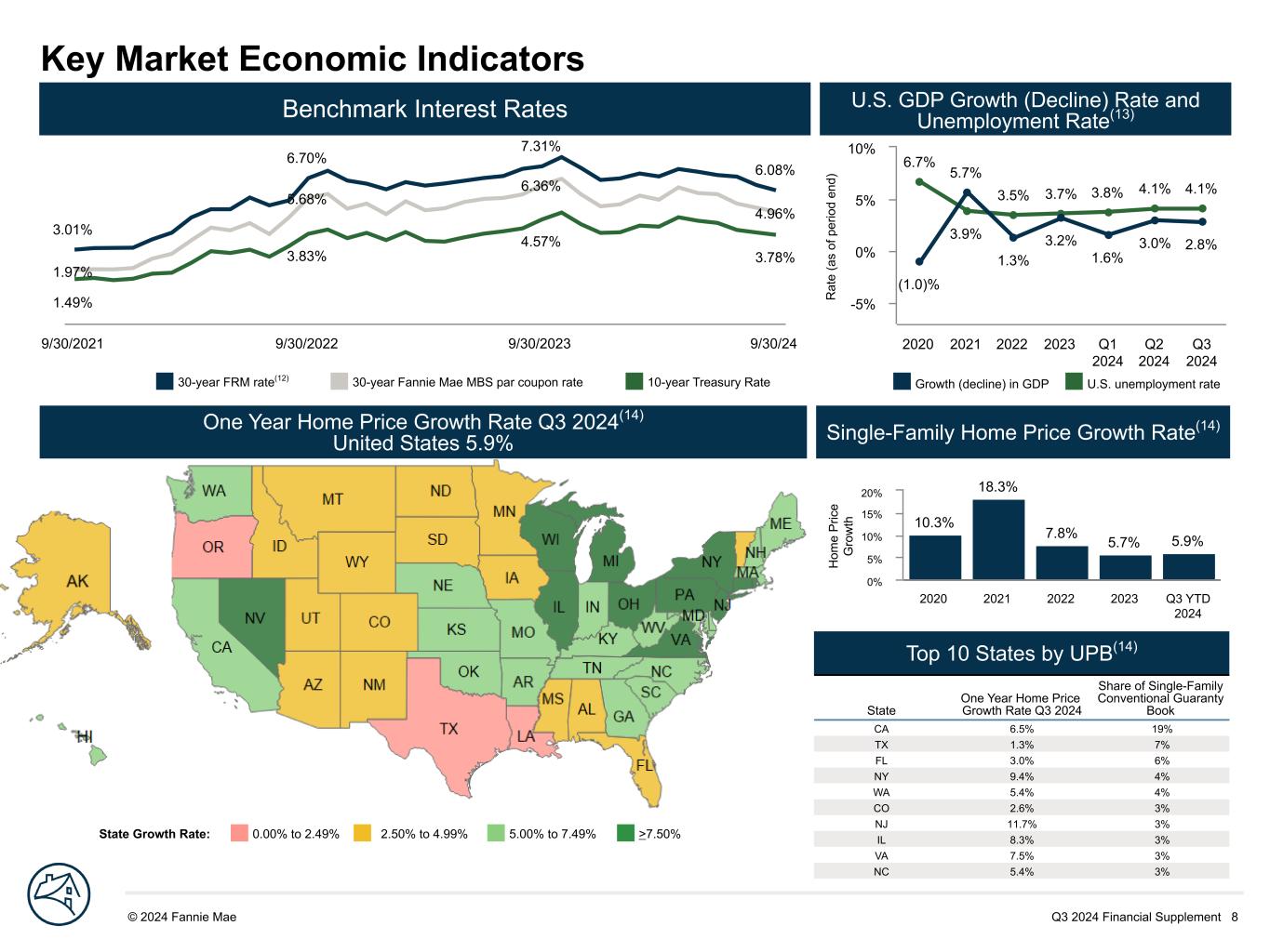 Q3 2024 Financial Supplement 8© 2024 Fannie Mae DRAFT State Growth Rate: 0.00% to 2.49% 2.50% to 4.99% 5.00% to 7.49% >7.50% 30-year FRM rate(12) 30-year Fannie Mae MBS par coupon rate 10-year Treasury Rate R at e (a s of p er io d en d) 6.7% 3.9% 3.5% 3.7% 3.8% 4.1% 4.1% (1.0)% 5.7% 1.3% 3.2% 1.6% 3.0% 2.8% 2020 2021 2022 2023 Q1 2024 Q2 2024 Q3 2024 -5% 0% 5% 10% Key Market Economic Indicators 1.49% 3.83% 4.57% 3.78% 1.97% 5.68% 6.36% 4.96% 3.01% 6.70% 7.31% 6.08% 9/30/2021 9/30/2022 9/30/2023 9/30/24 Top 10 States by UPB(14) State One Year Home Price Growth Rate Q3 2024 Share of Single-Family Conventional Guaranty Book CA 6.5% 19% TX 1.3% 7% FL 3.0% 6% NY 9.4% 4% WA 5.4% 4% CO 2.6% 3% NJ 11.7% 3% IL 8.3% 3% VA 7.5% 3% NC 5.4% 3% H om e P ric e G ro w th 10.3% 18.3% 7.8% 5.7% 5.9% 2020 2021 2022 2023 Q3 YTD 2024 0% 5% 10% 15% 20% Benchmark Interest Rates U.S. GDP Growth (Decline) Rate and Unemployment Rate(13) One Year Home Price Growth Rate Q3 2024(14) United States 5.9% Single-Family Home Price Growth Rate(14) Growth (decline) in GDP U.S. unemployment rate