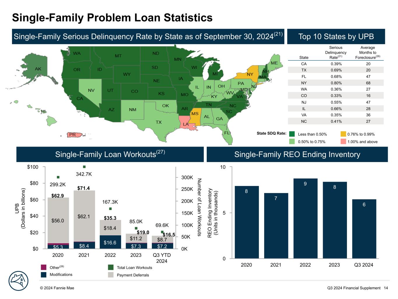 Q3 2024 Financial Supplement 14© 2024 Fannie Mae DRAFT U P B (D ol la rs in b illi on s) N um ber of Loan W orkouts $5.3 $8.4 $16.6 $7.3 $7.2 $56.0 $62.1 $18.4 $11.2 $8.7 299.2K 342.7K 167.3K 85.0K 69.6K 2020 2021 2022 2023 Q3 YTD 2024 $0 $20 $40 $60 $80 $100 0K 50K 100K 150K 200K 250K 300K R E O E nd in g In ve nt or y (U ni ts in th ou sa nd s) 8 7 9 8 6 2020 2021 2022 2023 Q3 2024 0 5 10 Single-Family Problem Loan Statistics State Serious Delinquency Rate(21) Average Months to Foreclosure(26) CA 0.39% 20 TX 0.69% 20 FL 0.68% 47 NY 0.80% 68 WA 0.36% 27 CO 0.33% 16 NJ 0.55% 47 IL 0.66% 28 VA 0.35% 36 NC 0.41% 27 Single-Family Serious Delinquency Rate by State as of September 30, 2024(21) Top 10 States by UPB Single-Family Loan Workouts(27) Single-Family REO Ending Inventory Less than 0.50% 0.76% to 0.99% 0.50% to 0.75% 1.00% and above Other(28) Total Loan Workouts Modifications Payment Deferrals $35.3 $71.4 $62.9 State SDQ Rate: $19.0 $16.5