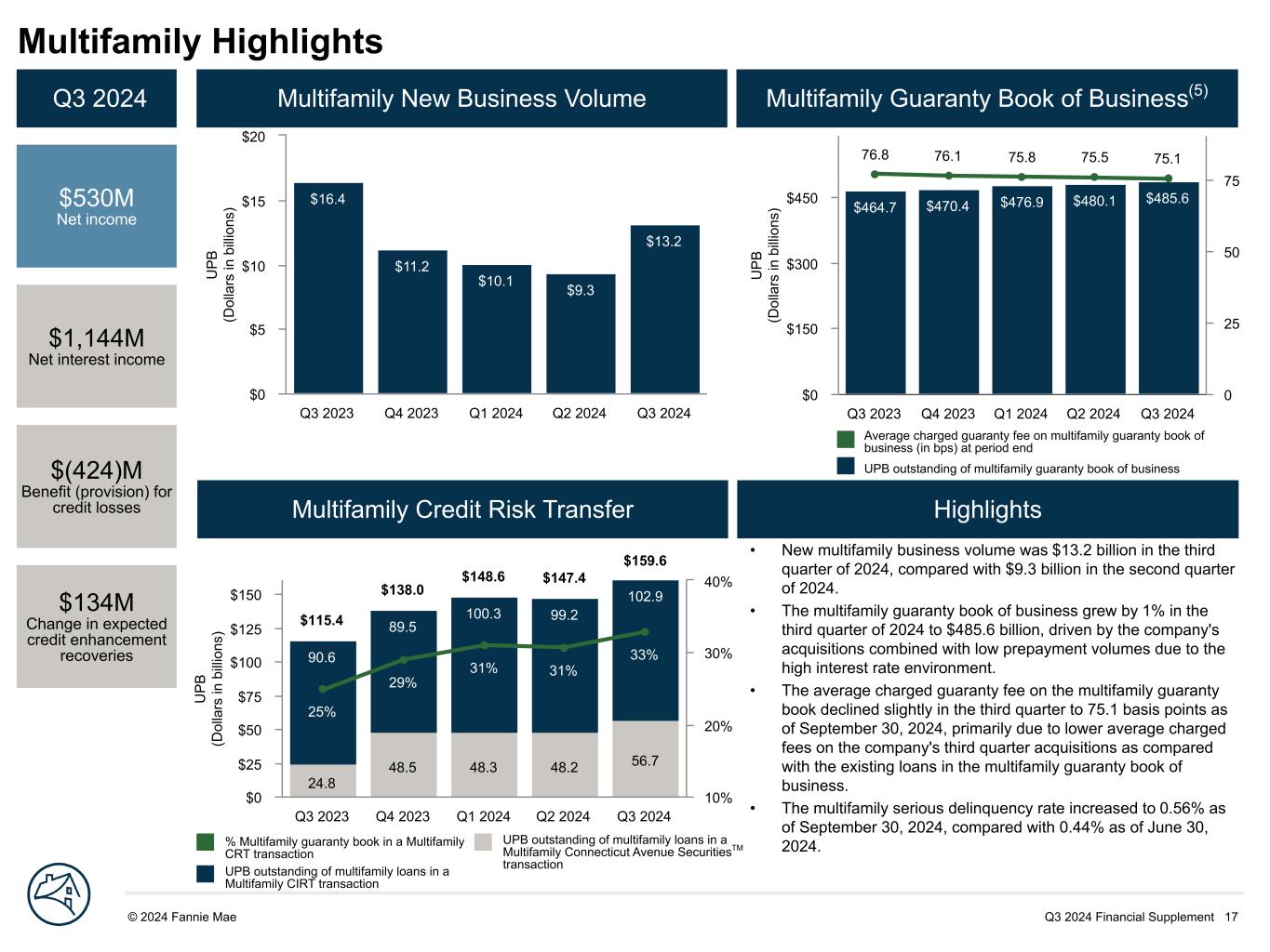 Q3 2024 Financial Supplement 17© 2024 Fannie Mae DRAFT U P B (D ol la rs in b illi on s) $464.7 $470.4 $476.9 $480.1 $485.6 76.8 76.1 75.8 75.5 75.1 Q3 2023 Q4 2023 Q1 2024 Q2 2024 Q3 2024 $0 $150 $300 $450 0 25 50 75 U P B (D ol la rs in b illi on s) $16.4 $11.2 $10.1 $9.3 $13.2 Q3 2023 Q4 2023 Q1 2024 Q2 2024 Q3 2024 $0 $5 $10 $15 $20 Multifamily Highlights Q3 2024 $530M Net income $1,144M Net interest income $(424)M Benefit (provision) for credit losses $134M Change in expected credit enhancement recoveries Multifamily New Business Volume Multifamily Guaranty Book of Business(5) Multifamily Credit Risk Transfer Highlights U P B (D ol la rs in b illi on s) 24.8 48.5 48.3 48.2 56.7 90.6 89.5 100.3 99.2 102.9 25% 29% 31% 31% 33% $115.4 $138.0 $148.6 $147.4 $159.6 Q3 2023 Q4 2023 Q1 2024 Q2 2024 Q3 2024 $0 $25 $50 $75 $100 $125 $150 10% 20% 30% 40% Average charged guaranty fee on multifamily guaranty book of business (in bps) at period end UPB outstanding of multifamily guaranty book of business UPB outstanding of multifamily loans in a Multifamily Connecticut Avenue SecuritiesTM transaction % Multifamily guaranty book in a Multifamily CRT transaction UPB outstanding of multifamily loans in a Multifamily CIRT transaction • New multifamily business volume was $13.2 billion in the third quarter of 2024, compared with $9.3 billion in the second quarter of 2024. • The multifamily guaranty book of business grew by 1% in the third quarter of 2024 to $485.6 billion, driven by the company's acquisitions combined with low prepayment volumes due to the high interest rate environment. • The average charged guaranty fee on the multifamily guaranty book declined slightly in the third quarter to 75.1 basis points as of September 30, 2024, primarily due to lower average charged fees on the company's third quarter acquisitions as compared with the existing loans in the multifamily guaranty book of business. • The multifamily serious delinquency rate increased to 0.56% as of September 30, 2024, compared with 0.44% as of June 30, 2024.