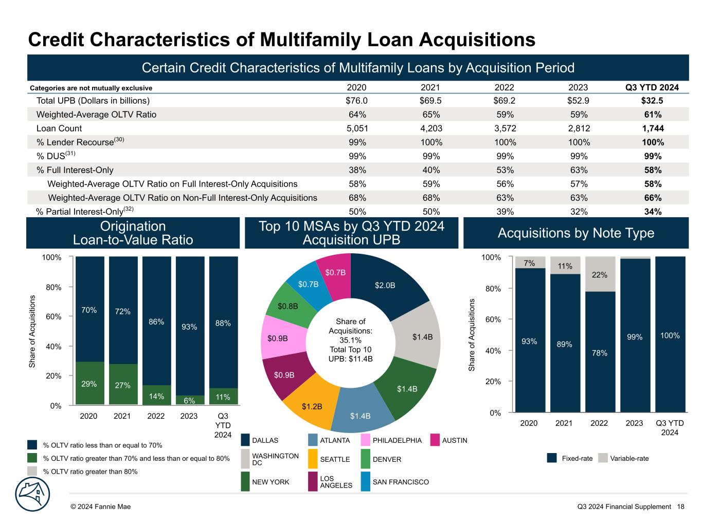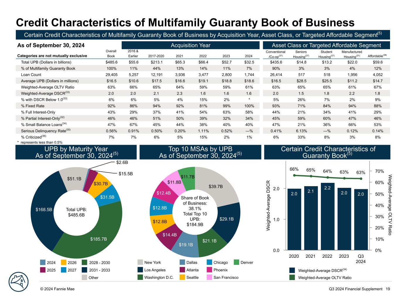 Q3 2024 Financial Supplement 18© 2024 Fannie Mae DRAFT S ha re o f A cq ui si tio ns 93% 89% 78% 99% 100% 7% 11% 22% 2020 2021 2022 2023 Q3 YTD 2024 0% 20% 40% 60% 80% 100% Credit Characteristics of Multifamily Loan Acquisitions Certain Credit Characteristics of Multifamily Loans by Acquisition Period Categories are not mutually exclusive 2020 2021 2022 2023 Q3 YTD 2024 Total UPB (Dollars in billions) $76.0 $69.5 $69.2 $52.9 $32.5 Weighted-Average OLTV Ratio 64% 65% 59% 59% 61% Loan Count 5,051 4,203 3,572 2,812 1,744 % Lender Recourse(30) 99% 100% 100% 100% 100% % DUS(31) 99% 99% 99% 99% 99% % Full Interest-Only 38% 40% 53% 63% 58% Weighted-Average OLTV Ratio on Full Interest-Only Acquisitions 58% 59% 56% 57% 58% Weighted-Average OLTV Ratio on Non-Full Interest-Only Acquisitions 68% 68% 63% 63% 66% % Partial Interest-Only(32) 50% 50% 39% 32% 34% S ha re o f A cq ui si tio ns 29% 27% 14% 6% 11% 70% 72% 86% 93% 88% 2020 2021 2022 2023 Q3 YTD 2024 0% 20% 40% 60% 80% 100% $2.0B $1.4B $1.4B $1.4B $1.2B $0.9B $0.9B $0.8B $0.7B $0.7B Share of Acquisitions: 35.1% Total Top 10 UPB: $11.4B Origination Loan-to-Value Ratio Top 10 MSAs by Q3 YTD 2024 Acquisition UPB Acquisitions by Note Type % OLTV ratio less than or equal to 70% % OLTV ratio greater than 70% and less than or equal to 80% % OLTV ratio greater than 80% Fixed-rate Variable-rate DALLAS ATLANTA PHILADELPHIA AUSTIN WASHINGTON DC SEATTLE DENVER NEW YORK LOS ANGELES SAN FRANCISCO