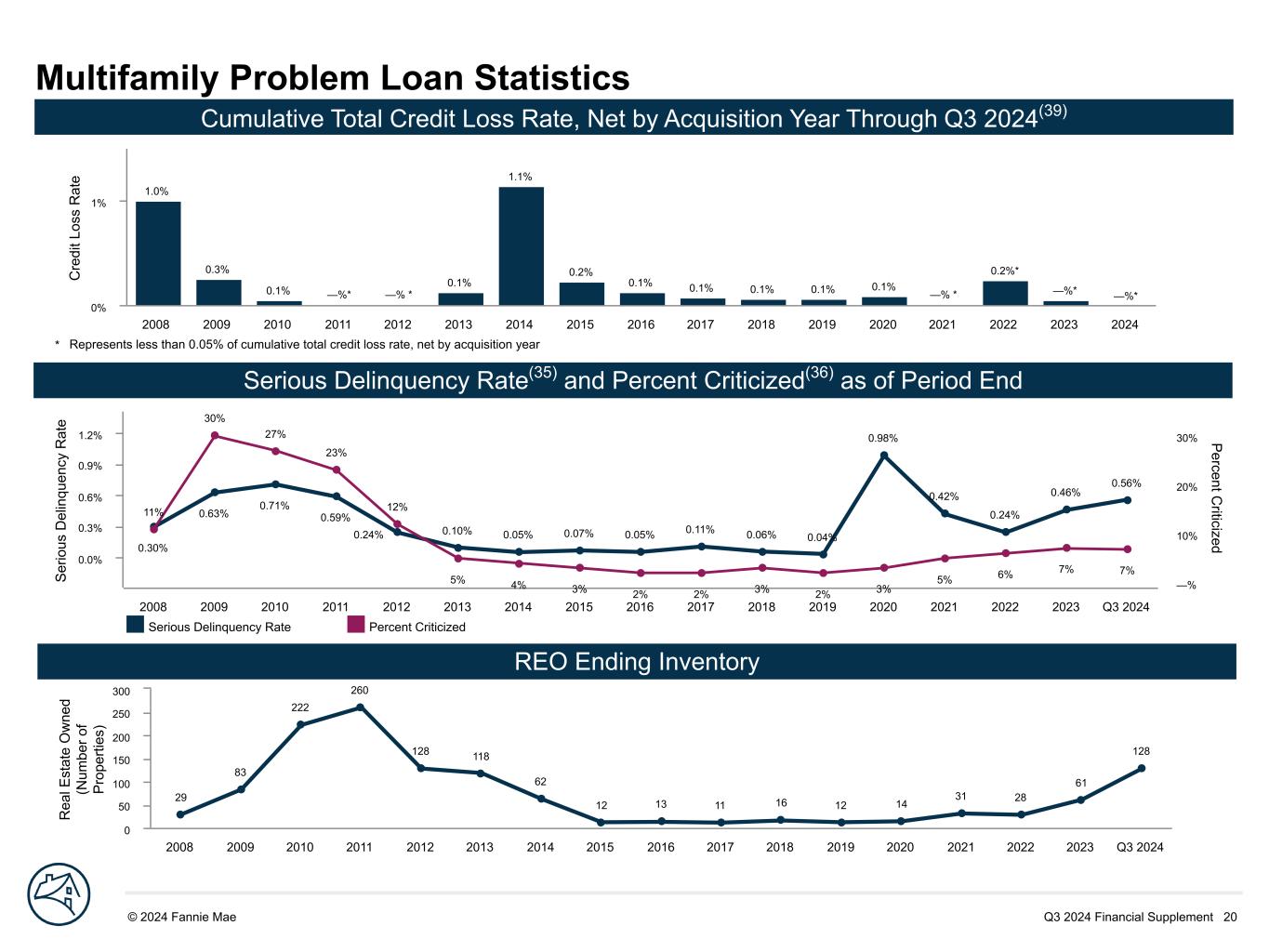 Q3 2024 Financial Supplement 20© 2024 Fannie Mae DRAFT S er io us D el in qu en cy R at e P ercent C riticized0.30% 0.63% 0.71% 0.59% 0.24% 0.10% 0.05% 0.07% 0.05% 0.11% 0.06% 0.04% 0.98% 0.42% 0.24% 0.46% 0.56% 11% 30% 27% 23% 12% 5% 4% 3% 2% 2% 3% 2% 3% 5% 6% 7% 7% 2008 2009 2010 2011 2012 2013 2014 2015 2016 2017 2018 2019 2020 2021 2022 2023 Q3 2024 0.0% 0.3% 0.6% 0.9% 1.2% —% 10% 20% 30% Multifamily Problem Loan Statistics C re di t L os s R at e 1.0% 0.3% 0.1% —%* —% * 0.1% 1.1% 0.2% 0.1% 0.1% 0.1% 0.1% 0.1% —% * 0.2%* —%* —%* 2008 2009 2010 2011 2012 2013 2014 2015 2016 2017 2018 2019 2020 2021 2022 2023 2024 0% 1% Serious Delinquency Rate(35) and Percent Criticized(36) as of Period End Cumulative Total Credit Loss Rate, Net by Acquisition Year Through Q3 2024(39) * Represents less than 0.05% of cumulative total credit loss rate, net by acquisition year R ea l E st at e O w ne d (N um be r o f P ro pe rti es ) 29 83 222 260 128 118 62 12 13 11 16 12 14 31 28 61 128 2008 2009 2010 2011 2012 2013 2014 2015 2016 2017 2018 2019 2020 2021 2022 2023 Q3 2024 0 50 100 150 200 250 300 REO Ending Inventory Serious Delinquency Rate Percent Criticized