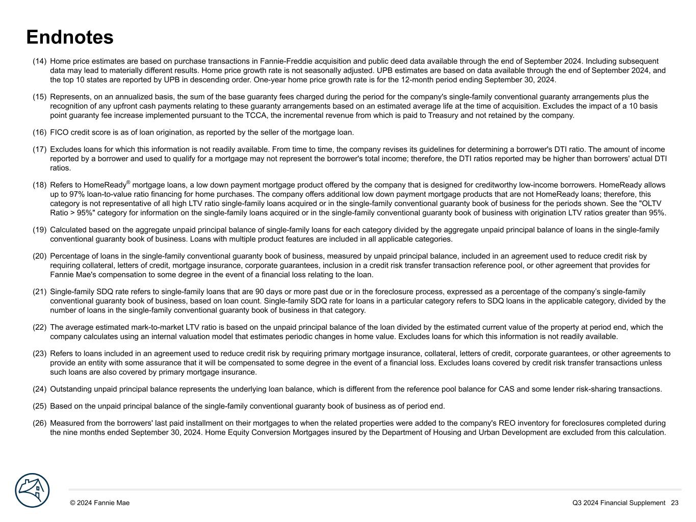 Q3 2024 Financial Supplement 23© 2024 Fannie Mae DRAFT Endnotes (14) Home price estimates are based on purchase transactions in Fannie-Freddie acquisition and public deed data available through the end of September 2024. Including subsequent data may lead to materially different results. Home price growth rate is not seasonally adjusted. UPB estimates are based on data available through the end of September 2024, and the top 10 states are reported by UPB in descending order. One-year home price growth rate is for the 12-month period ending September 30, 2024. (15) Represents, on an annualized basis, the sum of the base guaranty fees charged during the period for the company's single-family conventional guaranty arrangements plus the recognition of any upfront cash payments relating to these guaranty arrangements based on an estimated average life at the time of acquisition. Excludes the impact of a 10 basis point guaranty fee increase implemented pursuant to the TCCA, the incremental revenue from which is paid to Treasury and not retained by the company. (16) FICO credit score is as of loan origination, as reported by the seller of the mortgage loan. (17) Excludes loans for which this information is not readily available. From time to time, the company revises its guidelines for determining a borrower's DTI ratio. The amount of income reported by a borrower and used to qualify for a mortgage may not represent the borrower's total income; therefore, the DTI ratios reported may be higher than borrowers' actual DTI ratios. (18) Refers to HomeReady® mortgage loans, a low down payment mortgage product offered by the company that is designed for creditworthy low-income borrowers. HomeReady allows up to 97% loan-to-value ratio financing for home purchases. The company offers additional low down payment mortgage products that are not HomeReady loans; therefore, this category is not representative of all high LTV ratio single-family loans acquired or in the single-family conventional guaranty book of business for the periods shown. See the "OLTV Ratio > 95%" category for information on the single-family loans acquired or in the single-family conventional guaranty book of business with origination LTV ratios greater than 95%. (19) Calculated based on the aggregate unpaid principal balance of single-family loans for each category divided by the aggregate unpaid principal balance of loans in the single-family conventional guaranty book of business. Loans with multiple product features are included in all applicable categories. (20) Percentage of loans in the single-family conventional guaranty book of business, measured by unpaid principal balance, included in an agreement used to reduce credit risk by requiring collateral, letters of credit, mortgage insurance, corporate guarantees, inclusion in a credit risk transfer transaction reference pool, or other agreement that provides for Fannie Mae's compensation to some degree in the event of a financial loss relating to the loan. (21) Single-family SDQ rate refers to single-family loans that are 90 days or more past due or in the foreclosure process, expressed as a percentage of the company’s single-family conventional guaranty book of business, based on loan count. Single-family SDQ rate for loans in a particular category refers to SDQ loans in the applicable category, divided by the number of loans in the single-family conventional guaranty book of business in that category. (22) The average estimated mark-to-market LTV ratio is based on the unpaid principal balance of the loan divided by the estimated current value of the property at period end, which the company calculates using an internal valuation model that estimates periodic changes in home value. Excludes loans for which this information is not readily available. (23) Refers to loans included in an agreement used to reduce credit risk by requiring primary mortgage insurance, collateral, letters of credit, corporate guarantees, or other agreements to provide an entity with some assurance that it will be compensated to some degree in the event of a financial loss. Excludes loans covered by credit risk transfer transactions unless such loans are also covered by primary mortgage insurance. (24) Outstanding unpaid principal balance represents the underlying loan balance, which is different from the reference pool balance for CAS and some lender risk-sharing transactions. (25) Based on the unpaid principal balance of the single-family conventional guaranty book of business as of period end. (26) Measured from the borrowers' last paid installment on their mortgages to when the related properties were added to the company's REO inventory for foreclosures completed during the nine months ended September 30, 2024. Home Equity Conversion Mortgages insured by the Department of Housing and Urban Development are excluded from this calculation.