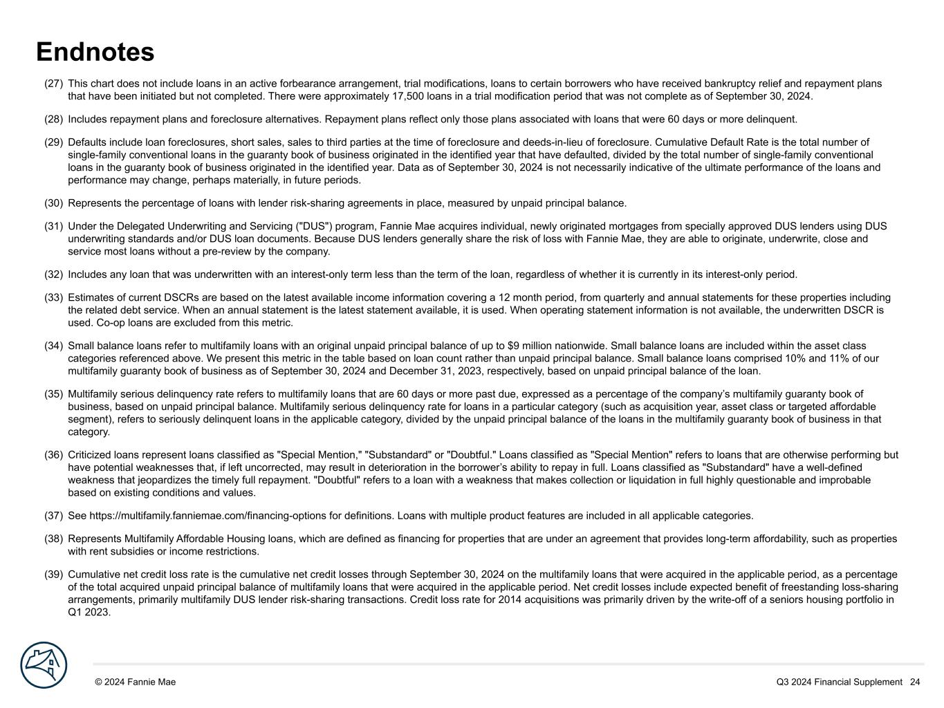 Q3 2024 Financial Supplement 24© 2024 Fannie Mae DRAFT (27) This chart does not include loans in an active forbearance arrangement, trial modifications, loans to certain borrowers who have received bankruptcy relief and repayment plans that have been initiated but not completed. There were approximately 17,500 loans in a trial modification period that was not complete as of September 30, 2024. (28) Includes repayment plans and foreclosure alternatives. Repayment plans reflect only those plans associated with loans that were 60 days or more delinquent. (29) Defaults include loan foreclosures, short sales, sales to third parties at the time of foreclosure and deeds-in-lieu of foreclosure. Cumulative Default Rate is the total number of single-family conventional loans in the guaranty book of business originated in the identified year that have defaulted, divided by the total number of single-family conventional loans in the guaranty book of business originated in the identified year. Data as of September 30, 2024 is not necessarily indicative of the ultimate performance of the loans and performance may change, perhaps materially, in future periods. (30) Represents the percentage of loans with lender risk-sharing agreements in place, measured by unpaid principal balance. (31) Under the Delegated Underwriting and Servicing ("DUS") program, Fannie Mae acquires individual, newly originated mortgages from specially approved DUS lenders using DUS underwriting standards and/or DUS loan documents. Because DUS lenders generally share the risk of loss with Fannie Mae, they are able to originate, underwrite, close and service most loans without a pre-review by the company. (32) Includes any loan that was underwritten with an interest-only term less than the term of the loan, regardless of whether it is currently in its interest-only period. (33) Estimates of current DSCRs are based on the latest available income information covering a 12 month period, from quarterly and annual statements for these properties including the related debt service. When an annual statement is the latest statement available, it is used. When operating statement information is not available, the underwritten DSCR is used. Co-op loans are excluded from this metric. (34) Small balance loans refer to multifamily loans with an original unpaid principal balance of up to $9 million nationwide. Small balance loans are included within the asset class categories referenced above. We present this metric in the table based on loan count rather than unpaid principal balance. Small balance loans comprised 10% and 11% of our multifamily guaranty book of business as of September 30, 2024 and December 31, 2023, respectively, based on unpaid principal balance of the loan. (35) Multifamily serious delinquency rate refers to multifamily loans that are 60 days or more past due, expressed as a percentage of the company’s multifamily guaranty book of business, based on unpaid principal balance. Multifamily serious delinquency rate for loans in a particular category (such as acquisition year, asset class or targeted affordable segment), refers to seriously delinquent loans in the applicable category, divided by the unpaid principal balance of the loans in the multifamily guaranty book of business in that category. (36) Criticized loans represent loans classified as "Special Mention," "Substandard" or "Doubtful." Loans classified as "Special Mention" refers to loans that are otherwise performing but have potential weaknesses that, if left uncorrected, may result in deterioration in the borrower’s ability to repay in full. Loans classified as "Substandard" have a well-defined weakness that jeopardizes the timely full repayment. "Doubtful" refers to a loan with a weakness that makes collection or liquidation in full highly questionable and improbable based on existing conditions and values. (37) See https://multifamily.fanniemae.com/financing-options for definitions. Loans with multiple product features are included in all applicable categories. (38) Represents Multifamily Affordable Housing loans, which are defined as financing for properties that are under an agreement that provides long-term affordability, such as properties with rent subsidies or income restrictions. (39) Cumulative net credit loss rate is the cumulative net credit losses through September 30, 2024 on the multifamily loans that were acquired in the applicable period, as a percentage of the total acquired unpaid principal balance of multifamily loans that were acquired in the applicable period. Net credit losses include expected benefit of freestanding loss-sharing arrangements, primarily multifamily DUS lender risk-sharing transactions. Credit loss rate for 2014 acquisitions was primarily driven by the write-off of a seniors housing portfolio in Q1 2023. Endnotes