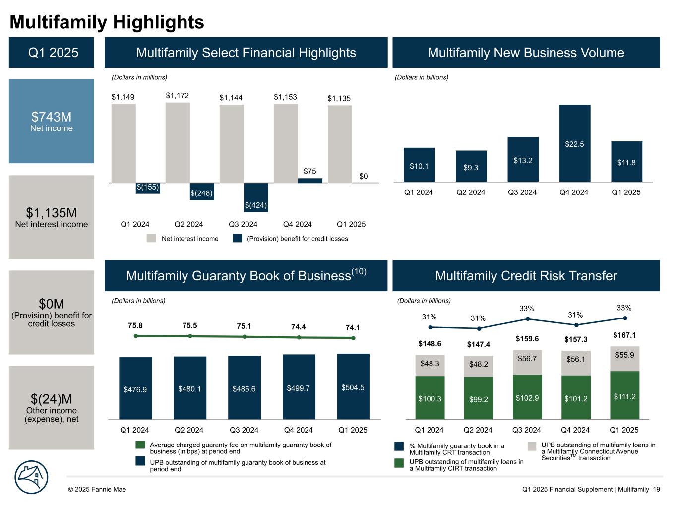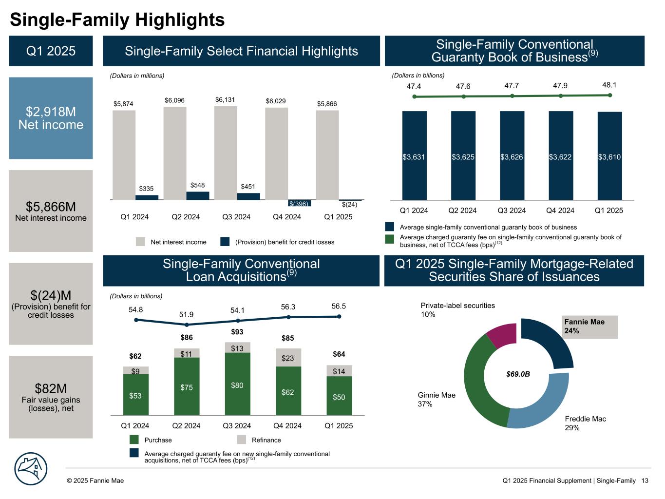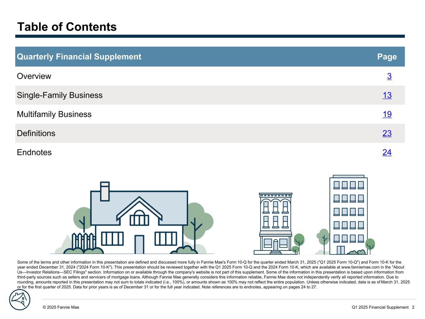Q1 2025 Financial Supplement 2© 2025 Fannie Mae DRAFT Quarterly Financial Supplement Page Overview 3 Single-Family Business 13 Multifamily Business 19 Definitions 23 Endnotes 24 Table of Contents Some of the terms and other information in this presentation are defined and discussed more fully in Fannie Mae's Form 10-Q for the quarter ended March 31, 2025 ("Q1 2025 Form 10-Q") and Form 10-K for the year ended December 31, 2024 ("2024 Form 10-K"). This presentation should be reviewed together with the Q1 2025 Form 10-Q and the 2024 Form 10-K, which are available at www.fanniemae.com in the "About Us—Investor Relations—SEC Filings" section. Information on or available through the company's website is not part of this supplement. Some of the information in this presentation is based upon information from third-party sources such as sellers and servicers of mortgage loans. Although Fannie Mae generally considers this information reliable, Fannie Mae does not independently verify all reported information. Due to rounding, amounts reported in this presentation may not sum to totals indicated (i.e., 100%), or amounts shown as 100% may not reflect the entire population. Unless otherwise indicated, data is as of March 31, 2025 or for the first quarter of 2025. Data for prior years is as of December 31 or for the full year indicated. Note references are to endnotes, appearing on pages 24 to 27.