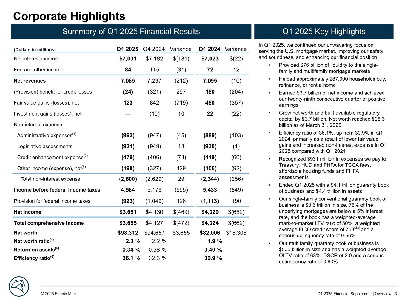 Q1 2025 Financial Supplement | Overview 3© 2025 Fannie Mae DRAFTCorporate Highlights (Dollars in millions) Q1 2025 Q4 2024 Variance Q1 2024 Variance Net interest income $7,001 $7,182 $(181) $7,023 $(22) Fee and other income 84 115 (31) 72 12 Net revenues 7,085 7,297 (212) 7,095 (10) (Provision) benefit for credit losses (24) (321) 297 180 (204) Fair value gains (losses), net 123 842 (719) 480 (357) Investment gains (losses), net — (10) 10 22 (22) Non-interest expense: Administrative expenses(1) (992) (947) (45) (889) (103) Legislative assessments (931) (949) 18 (930) (1) Credit enhancement expense(2) (479) (406) (73) (419) (60) Other income (expense), net(3) (198) (327) 129 (106) (92) Total non-interest expense (2,600) (2,629) 29 (2,344) (256) Income before federal income taxes 4,584 5,179 (595) 5,433 (849) Provision for federal income taxes (923) (1,049) 126 (1,113) 190 Net income $3,661 $4,130 $(469) $4,320 $(659) Total comprehensive income $3,655 $4,127 $(472) $4,324 $(669) Net worth $98,312 $94,657 $3,655 $82,006 $16,306 Net worth ratio(4) 2.3 % 2.2 % 1.9 % Return on assets(5) 0.34 % 0.38 % 0.40 % Efficiency ratio(6) 36.1 % 32.3 % 30.9 % Summary of Q1 2025 Financial Results Q1 2025 Key Highlights In Q1 2025, we continued our unwavering focus on serving the U.S. mortgage market, improving our safety and soundness, and enhancing our financial position • Provided $76 billion of liquidity to the single- family and multifamily mortgage markets • Helped approximately 287,000 households buy, refinance, or rent a home • Earned $3.7 billion of net income and achieved our twenty-ninth consecutive quarter of positive earnings • Grew net worth and built available regulatory capital by $3.7 billion. Net worth reached $98.3 billion as of March 31, 2025 • Efficiency ratio of 36.1%, up from 30.9% in Q1 2024, primarily as a result of lower fair value gains and increased non-interest expense in Q1 2025 compared with Q1 2024 • Recognized $931 million in expenses we pay to Treasury, HUD and FHFA for TCCA fees, affordable housing funds and FHFA assessments • Ended Q1 2025 with a $4.1 trillion guaranty book of business and $4.4 trillion in assets • Our single-family conventional guaranty book of business is $3.6 trillion in size, 76% of the underlying mortgages are below a 5% interest rate, and the book has a weighted-average mark-to-market LTV ratio of 50%, a weighted average FICO credit score of 753(33) and a serious delinquency rate of 0.56% • Our multifamily guaranty book of business is $505 billion in size and has a weighted-average OLTV ratio of 63%, DSCR of 2.0 and a serious delinquency rate of 0.63%
