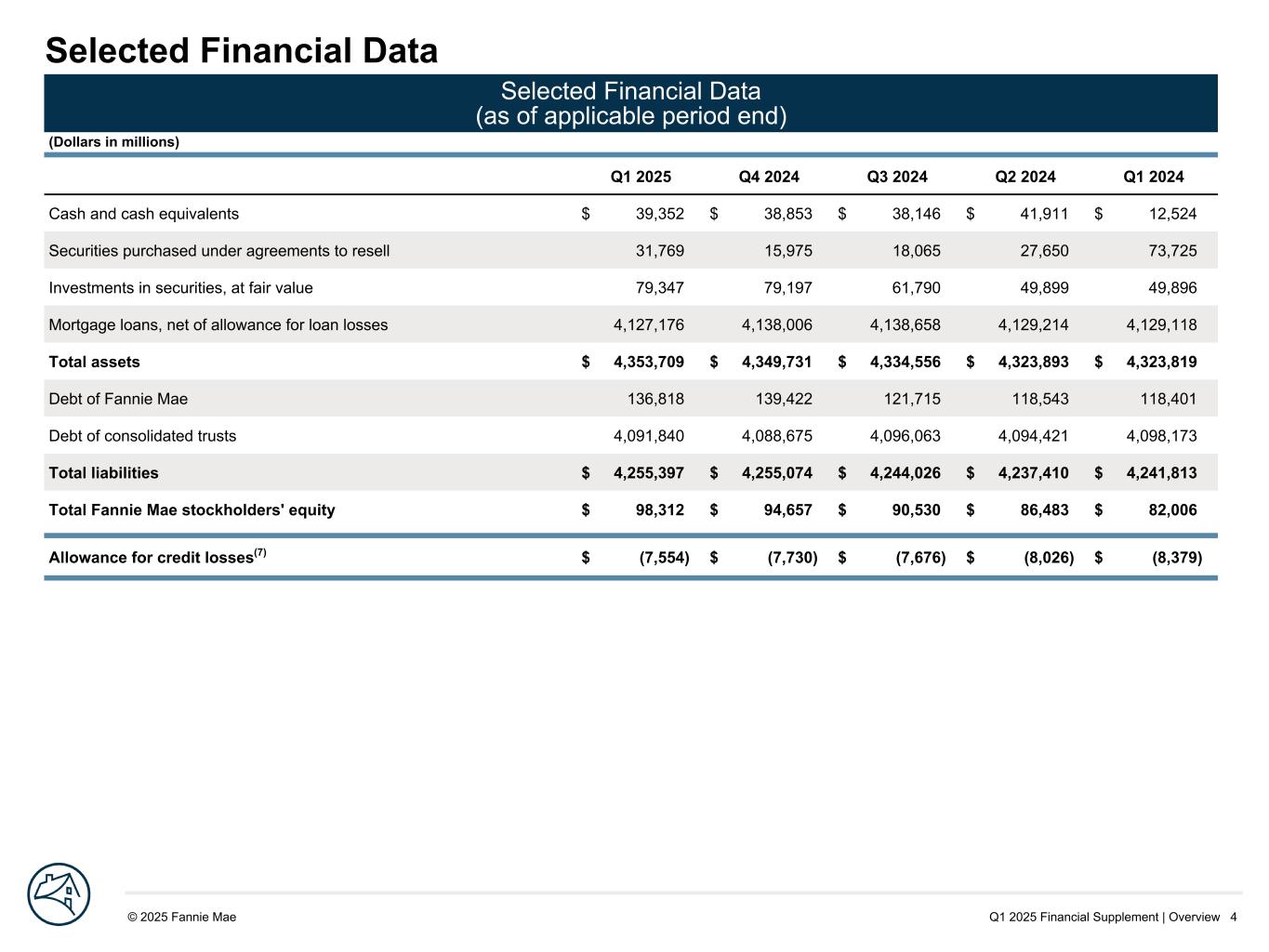 Q1 2025 Financial Supplement | Overview 4© 2025 Fannie Mae DRAFTSelected Financial Data Selected Financial Data (as of applicable period end) (Dollars in millions) Q1 2025 Q4 2024 Q3 2024 Q2 2024 Q1 2024 Cash and cash equivalents $ 39,352 $ 38,853 $ 38,146 $ 41,911 $ 12,524 Securities purchased under agreements to resell 31,769 15,975 18,065 27,650 73,725 Investments in securities, at fair value 79,347 79,197 61,790 49,899 49,896 Mortgage loans, net of allowance for loan losses 4,127,176 4,138,006 4,138,658 4,129,214 4,129,118 Total assets $ 4,353,709 $ 4,349,731 $ 4,334,556 $ 4,323,893 $ 4,323,819 Debt of Fannie Mae 136,818 139,422 121,715 118,543 118,401 Debt of consolidated trusts 4,091,840 4,088,675 4,096,063 4,094,421 4,098,173 Total liabilities $ 4,255,397 $ 4,255,074 $ 4,244,026 $ 4,237,410 $ 4,241,813 Total Fannie Mae stockholders' equity $ 98,312 $ 94,657 $ 90,530 $ 86,483 $ 82,006 Allowance for credit losses(7) $ (7,554) $ (7,730) $ (7,676) $ (8,026) $ (8,379)