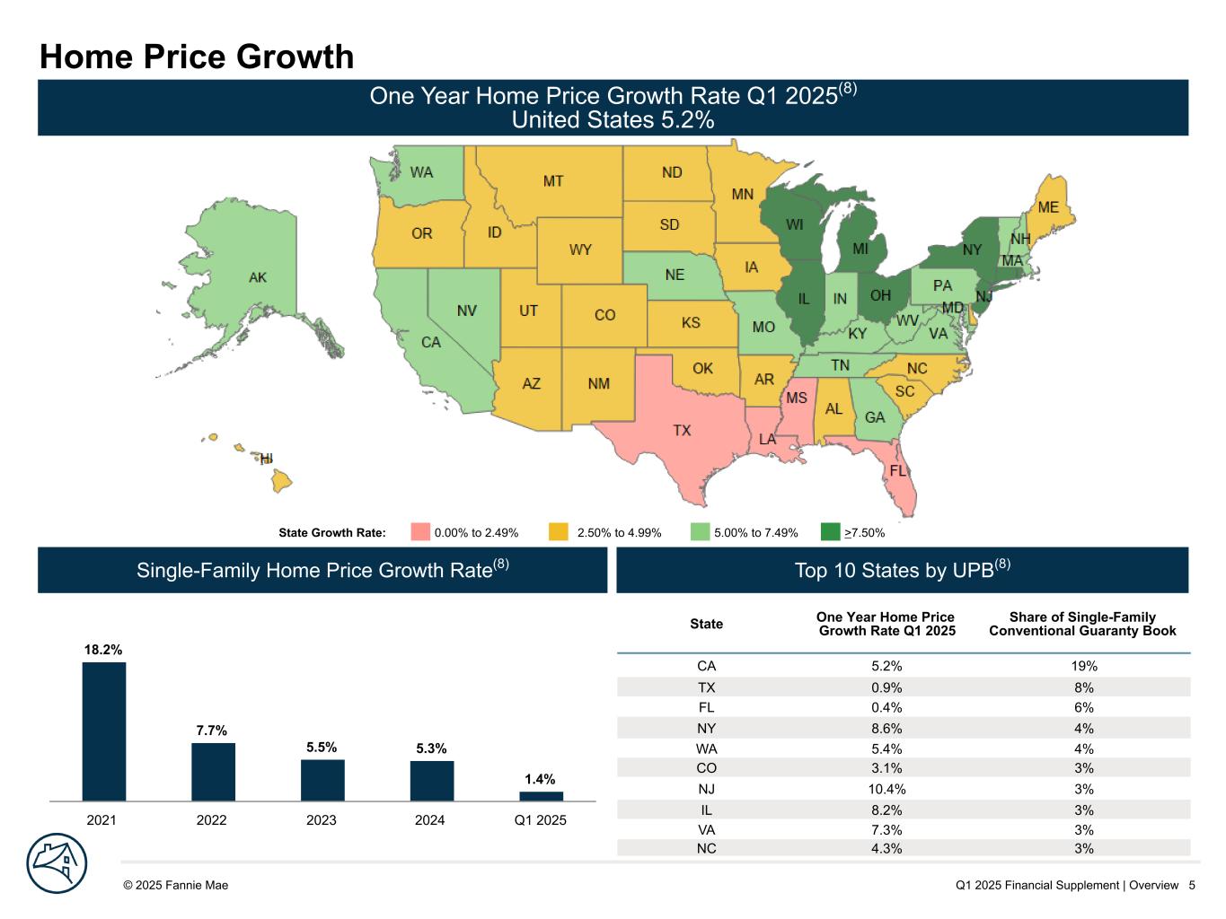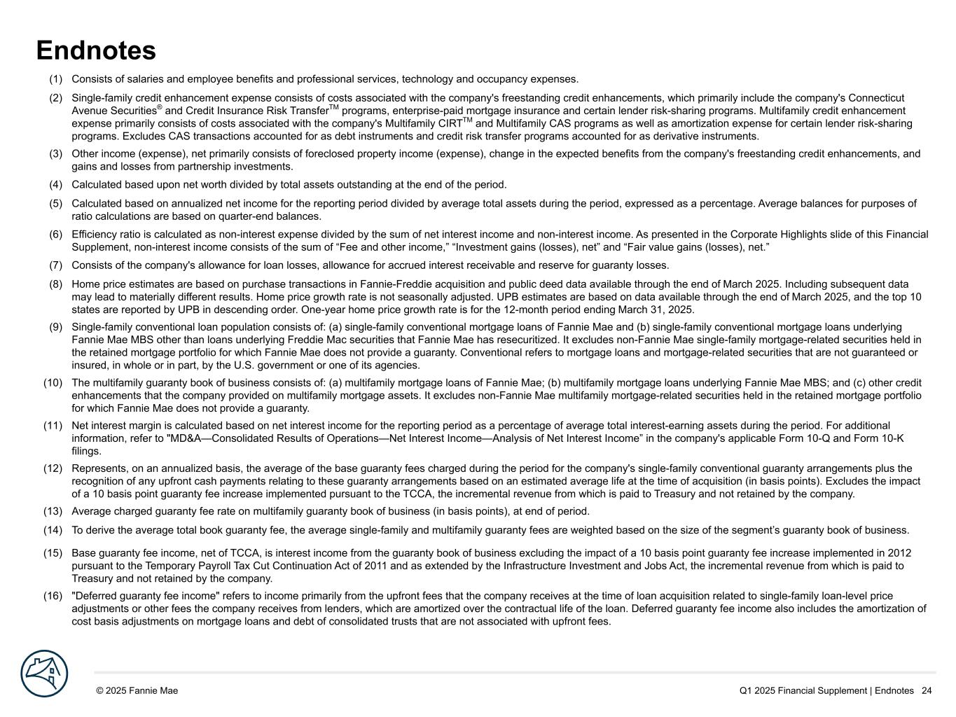 Q1 2025 Financial Supplement | Endnotes 24© 2025 Fannie Mae DRAFT Endnotes (1) Consists of salaries and employee benefits and professional services, technology and occupancy expenses. (2) Single-family credit enhancement expense consists of costs associated with the company's freestanding credit enhancements, which primarily include the company's Connecticut Avenue Securities® and Credit Insurance Risk TransferTM programs, enterprise-paid mortgage insurance and certain lender risk-sharing programs. Multifamily credit enhancement expense primarily consists of costs associated with the company's Multifamily CIRTTM and Multifamily CAS programs as well as amortization expense for certain lender risk-sharing programs. Excludes CAS transactions accounted for as debt instruments and credit risk transfer programs accounted for as derivative instruments. (3) Other income (expense), net primarily consists of foreclosed property income (expense), change in the expected benefits from the company's freestanding credit enhancements, and gains and losses from partnership investments. (4) Calculated based upon net worth divided by total assets outstanding at the end of the period. (5) Calculated based on annualized net income for the reporting period divided by average total assets during the period, expressed as a percentage. Average balances for purposes of ratio calculations are based on quarter-end balances. (6) Efficiency ratio is calculated as non-interest expense divided by the sum of net interest income and non-interest income. As presented in the Corporate Highlights slide of this Financial Supplement, non-interest income consists of the sum of “Fee and other income,” “Investment gains (losses), net” and “Fair value gains (losses), net.” (7) Consists of the company's allowance for loan losses, allowance for accrued interest receivable and reserve for guaranty losses. (8) Home price estimates are based on purchase transactions in Fannie-Freddie acquisition and public deed data available through the end of March 2025. Including subsequent data may lead to materially different results. Home price growth rate is not seasonally adjusted. UPB estimates are based on data available through the end of March 2025, and the top 10 states are reported by UPB in descending order. One-year home price growth rate is for the 12-month period ending March 31, 2025. (9) Single-family conventional loan population consists of: (a) single-family conventional mortgage loans of Fannie Mae and (b) single-family conventional mortgage loans underlying Fannie Mae MBS other than loans underlying Freddie Mac securities that Fannie Mae has resecuritized. It excludes non-Fannie Mae single-family mortgage-related securities held in the retained mortgage portfolio for which Fannie Mae does not provide a guaranty. Conventional refers to mortgage loans and mortgage-related securities that are not guaranteed or insured, in whole or in part, by the U.S. government or one of its agencies. (10) The multifamily guaranty book of business consists of: (a) multifamily mortgage loans of Fannie Mae; (b) multifamily mortgage loans underlying Fannie Mae MBS; and (c) other credit enhancements that the company provided on multifamily mortgage assets. It excludes non-Fannie Mae multifamily mortgage-related securities held in the retained mortgage portfolio for which Fannie Mae does not provide a guaranty. (11) Net interest margin is calculated based on net interest income for the reporting period as a percentage of average total interest-earning assets during the period. For additional information, refer to "MD&A—Consolidated Results of Operations—Net Interest Income—Analysis of Net Interest Income” in the company's applicable Form 10-Q and Form 10-K filings. (12) Represents, on an annualized basis, the average of the base guaranty fees charged during the period for the company's single-family conventional guaranty arrangements plus the recognition of any upfront cash payments relating to these guaranty arrangements based on an estimated average life at the time of acquisition (in basis points). Excludes the impact of a 10 basis point guaranty fee increase implemented pursuant to the TCCA, the incremental revenue from which is paid to Treasury and not retained by the company. (13) Average charged guaranty fee rate on multifamily guaranty book of business (in basis points), at end of period. (14) To derive the average total book guaranty fee, the average single-family and multifamily guaranty fees are weighted based on the size of the segment’s guaranty book of business. (15) Base guaranty fee income, net of TCCA, is interest income from the guaranty book of business excluding the impact of a 10 basis point guaranty fee increase implemented in 2012 pursuant to the Temporary Payroll Tax Cut Continuation Act of 2011 and as extended by the Infrastructure Investment and Jobs Act, the incremental revenue from which is paid to Treasury and not retained by the company. (16) "Deferred guaranty fee income" refers to income primarily from the upfront fees that the company receives at the time of loan acquisition related to single-family loan-level price adjustments or other fees the company receives from lenders, which are amortized over the contractual life of the loan. Deferred guaranty fee income also includes the amortization of cost basis adjustments on mortgage loans and debt of consolidated trusts that are not associated with upfront fees.
