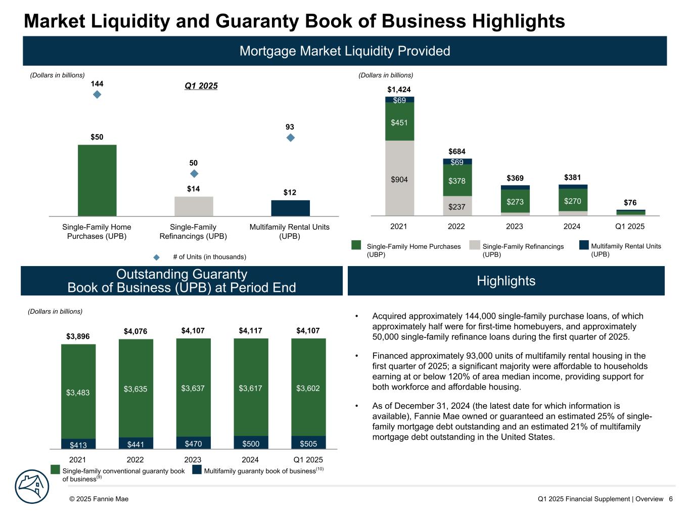 Q1 2025 Financial Supplement | Overview 6© 2025 Fannie Mae DRAFT $3,896 $4,076 $4,107 $4,117 $4,107 $413 $441 $470 $500 $505 $3,483 $3,635 $3,637 $3,617 $3,602 2021 2022 2023 2024 Q1 2025 Market Liquidity and Guaranty Book of Business Highlights $904 $237 $451 $378 $273 $270 $69 $69 $1,424 $684 $369 $381 $76 2021 2022 2023 2024 Q1 2025 Single-Family Home Purchases (UBP) Single-Family Refinancings (UPB) Multifamily Rental Units (UPB) Mortgage Market Liquidity Provided Single-family conventional guaranty book of business(9) Multifamily guaranty book of business(10) • Acquired approximately 144,000 single-family purchase loans, of which approximately half were for first-time homebuyers, and approximately 50,000 single-family refinance loans during the first quarter of 2025. • Financed approximately 93,000 units of multifamily rental housing in the first quarter of 2025; a significant majority were affordable to households earning at or below 120% of area median income, providing support for both workforce and affordable housing. • As of December 31, 2024 (the latest date for which information is available), Fannie Mae owned or guaranteed an estimated 25% of single- family mortgage debt outstanding and an estimated 21% of multifamily mortgage debt outstanding in the United States. $50 $14 $12 144 50 93 # of Units (in thousands) Single-Family Home Purchases (UPB) Single-Family Refinancings (UPB) Multifamily Rental Units (UPB) (Dollars in billions) (Dollars in billions) (Dollars in billions) Q1 2025 Outstanding Guaranty Book of Business (UPB) at Period End Highlights