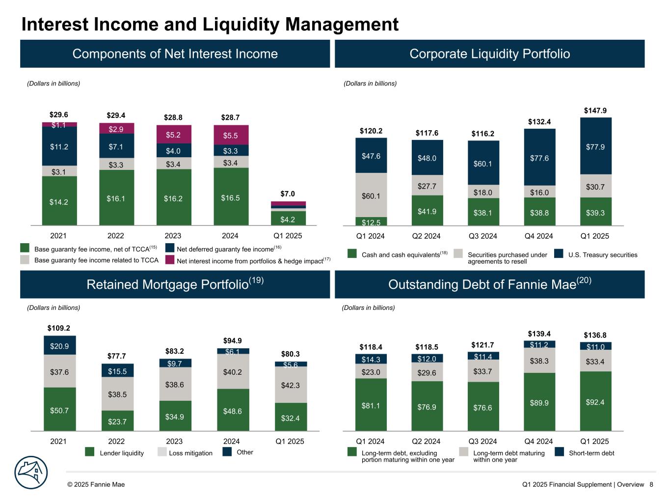 Q1 2025 Financial Supplement | Overview 8© 2025 Fannie Mae DRAFTInterest Income and Liquidity Management Components of Net Interest Income Corporate Liquidity Portfolio Retained Mortgage Portfolio(19) Outstanding Debt of Fannie Mae(20) $29.6 $29.4 $28.8 $28.7 $7.0 $14.2 $16.1 $16.2 $16.5 $4.2 $3.1 $3.3 $3.4 $3.4 $11.2 $7.1 $4.0 $3.3 $1.1 $2.9 $5.2 $5.5 2021 2022 2023 2024 Q1 2025 Base guaranty fee income, net of TCCA(15) Net deferred guaranty fee income(16) Base guaranty fee income related to TCCA Net interest income from portfolios & hedge impact(17) $81.1 $76.9 $76.6 $89.9 $92.4 $23.0 $29.6 $33.7 $38.3 $33.4$14.3 $12.0 $11.4 $11.2 $11.0$118.4 $118.5 $121.7 $139.4 $136.8 Q1 2024 Q2 2024 Q3 2024 Q4 2024 Q1 2025 $12.5 $41.9 $38.1 $38.8 $39.3 $60.1 $27.7 $18.0 $16.0 $30.7 $47.6 $48.0 $60.1 $77.6 $77.9 $120.2 $117.6 $116.2 $132.4 $147.9 Q1 2024 Q2 2024 Q3 2024 Q4 2024 Q1 2025 Cash and cash equivalents(18) Securities purchased under agreements to resell U.S. Treasury securities $109.2 $77.7 $83.2 $94.9 $80.3 $50.7 $23.7 $34.9 $48.6 $32.4 $37.6 $38.5 $38.6 $40.2 $42.3 $20.9 $15.5 $9.7 $6.1 $5.6 2021 2022 2023 2024 Q1 2025 Lender liquidity Loss mitigation Other (Dollars in billions) (Dollars in billions) (Dollars in billions) (Dollars in billions) Long-term debt, excluding portion maturing within one year Long-term debt maturing within one year Short-term debt