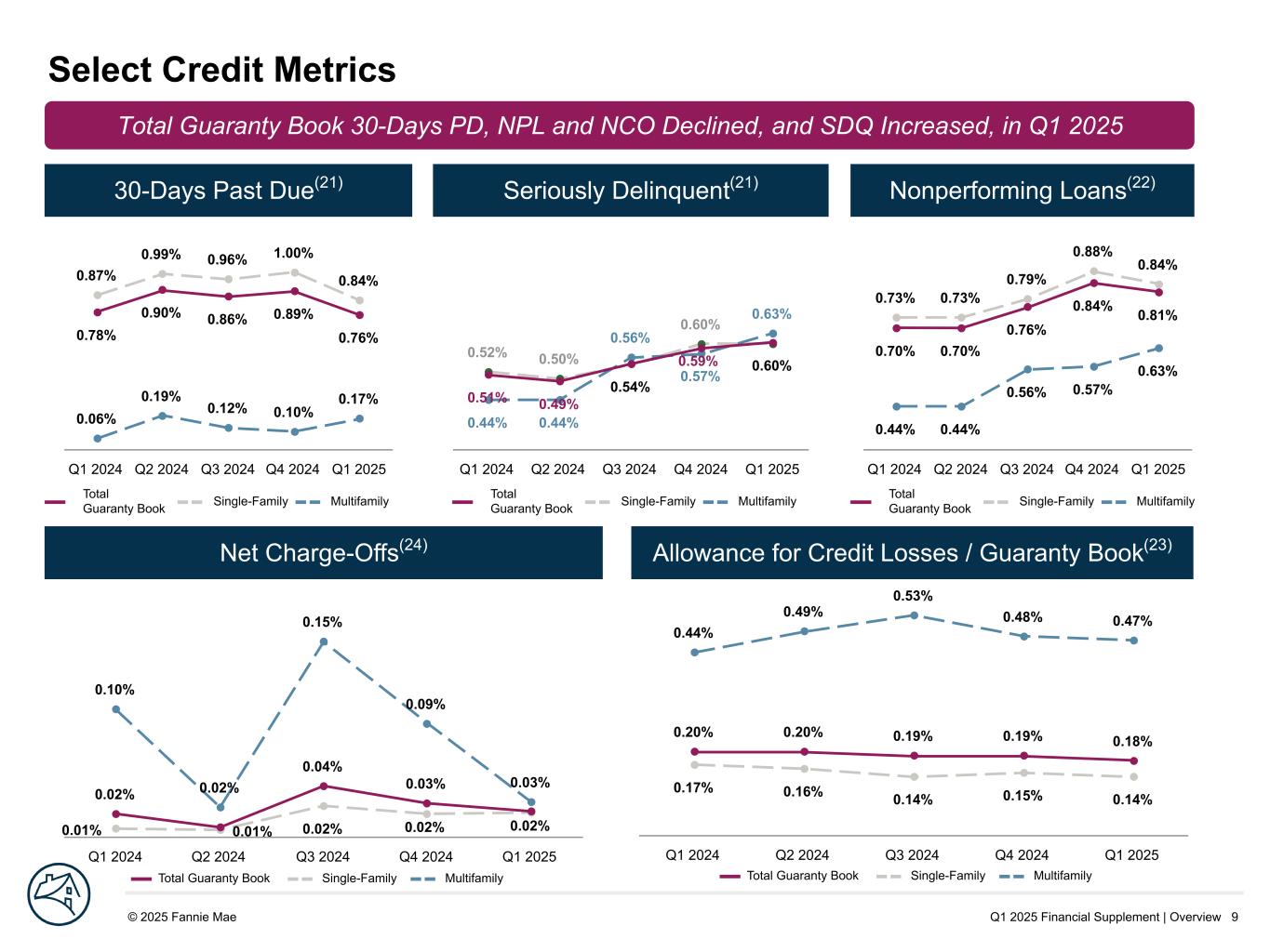Q1 2025 Financial Supplement | Overview 9© 2025 Fannie Mae DRAFT Select Credit Metrics 30-Days Past Due(21) Seriously Delinquent(21) Nonperforming Loans(22) 0.87% 0.99% 0.96% 1.00% 0.84% 0.06% 0.19% 0.12% 0.10% 0.17% 0.78% 0.90% 0.86% 0.89% 0.76% Q1 2024 Q2 2024 Q3 2024 Q4 2024 Q1 2025 0.52% 0.50% 0.60% 0.44% 0.44% 0.56% 0.57% 0.63% 0.51% 0.49% 0.54% 0.60% Q1 2024 Q2 2024 Q3 2024 Q4 2024 Q1 2025 0.73% 0.73% 0.79% 0.88% 0.84% 0.44% 0.44% 0.56% 0.57% 0.63% 0.70% 0.70% 0.76% 0.84% 0.81% Q1 2024 Q2 2024 Q3 2024 Q4 2024 Q1 2025 Net Charge-Offs(24) 0.01% 0.01% 0.02% 0.10% 0.02% 0.15% 0.09% 0.03% 0.02% 0.04% 0.03% Q1 2024 Q2 2024 Q3 2024 Q4 2024 Q1 2025 Allowance for Credit Losses / Guaranty Book(23) 0.17% 0.16% 0.14% 0.15% 0.14% 0.44% 0.49% 0.53% 0.48% 0.47% 0.20% 0.20% 0.19% 0.19% 0.18% Q1 2024 Q2 2024 Q3 2024 Q4 2024 Q1 2025 Total Guaranty Book 30-Days PD, NPL and NCO Declined, and SDQ Increased, in Q1 2025 Total Guaranty Book Single-Family Multifamily Total Guaranty Book Single-Family Multifamily Total Guaranty Book Single-Family Multifamily Total Guaranty Book Single-Family Multifamily Total Guaranty Book Single-Family Multifamily 0.59% 0.02%0.02%