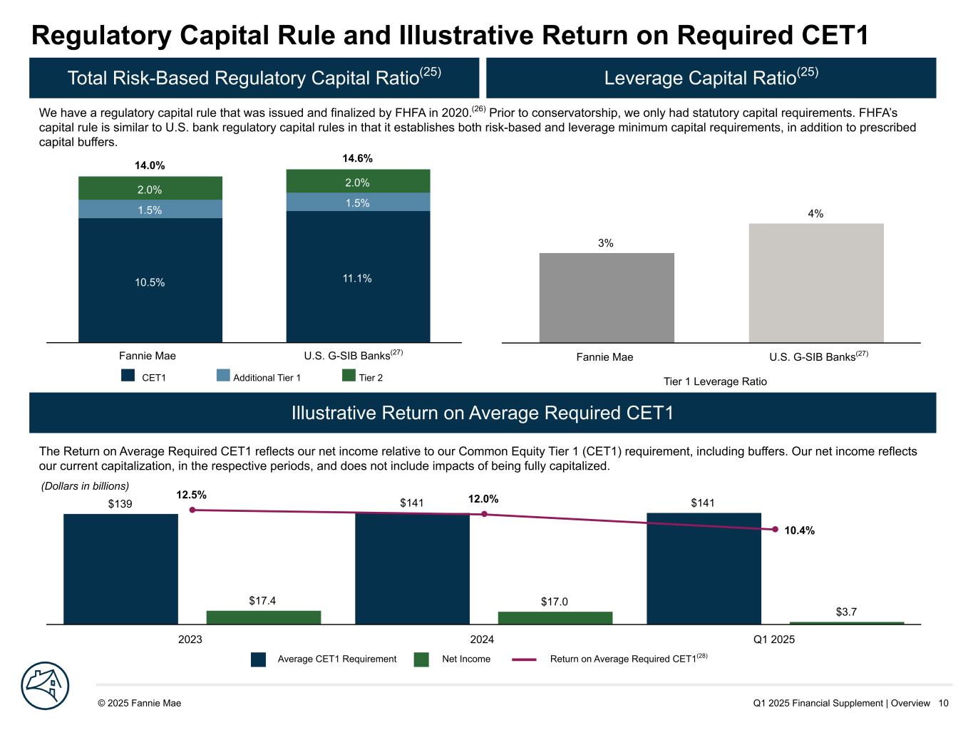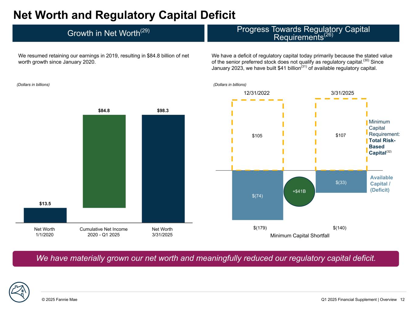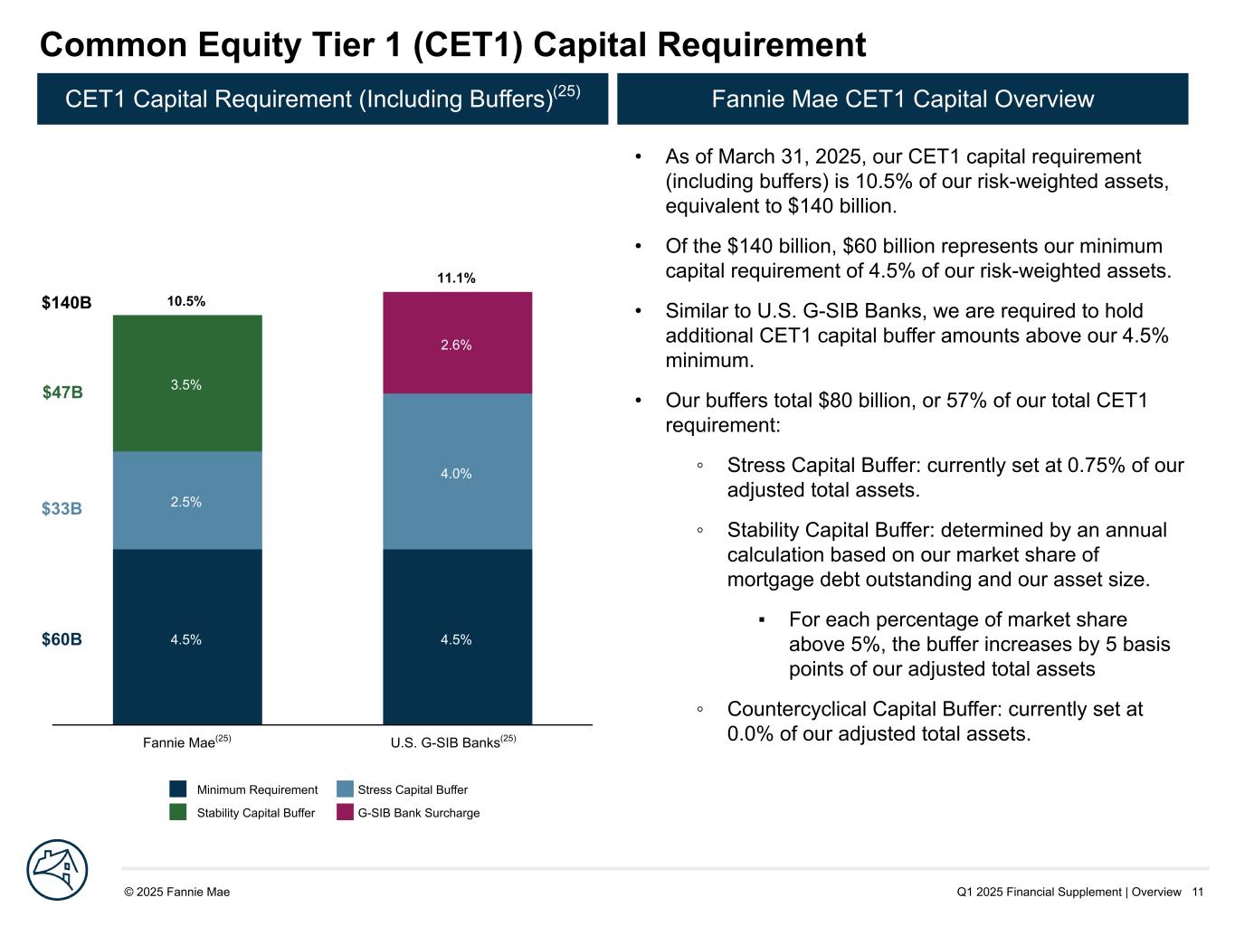 Q1 2025 Financial Supplement | Overview 11© 2025 Fannie Mae DRAFTCommon Equity Tier 1 (CET1) Capital Requirement CET1 Capital Requirement (Including Buffers)(25) Fannie Mae CET1 Capital Overview • As of March 31, 2025, our CET1 capital requirement (including buffers) is 10.5% of our risk-weighted assets, equivalent to $140 billion. • Of the $140 billion, $60 billion represents our minimum capital requirement of 4.5% of our risk-weighted assets. • Similar to U.S. G-SIB Banks, we are required to hold additional CET1 capital buffer amounts above our 4.5% minimum. • Our buffers total $80 billion, or 57% of our total CET1 requirement: ◦ Stress Capital Buffer: currently set at 0.75% of our adjusted total assets. ◦ Stability Capital Buffer: determined by an annual calculation based on our market share of mortgage debt outstanding and our asset size. ▪ For each percentage of market share above 5%, the buffer increases by 5 basis points of our adjusted total assets ◦ Countercyclical Capital Buffer: currently set at 0.0% of our adjusted total assets. 10.5% 11.1% 4.5% 4.5% 2.5% 4.0% 3.5% 2.6% Minimum Requirement Stress Capital Buffer Stability Capital Buffer G-SIB Bank Surcharge $140B $47B $33B $60B Fannie Mae(25) U.S. G-SIB Banks(25)
