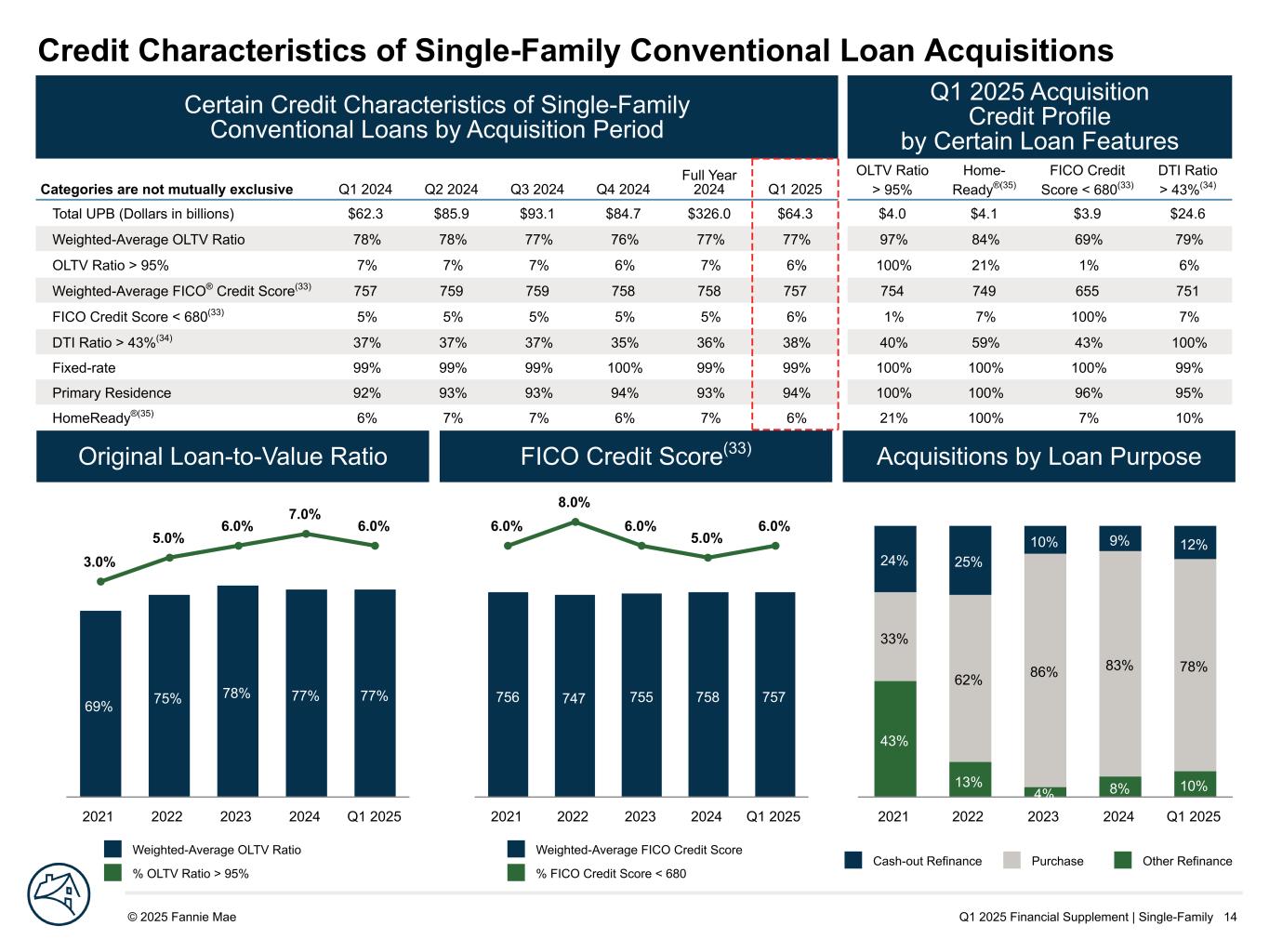 Q1 2025 Financial Supplement | Single-Family 13© 2025 Fannie Mae DRAFT Fannie Mae 24% Freddie Mac 29% Ginnie Mae 37% Private-label securities 10% $3,631 $3,625 $3,626 $3,622 $3,610 47.4 47.6 47.7 47.9 48.1 Q1 2024 Q2 2024 Q3 2024 Q4 2024 Q1 2025 $53 $75 $80 $62 $50 $9 $11 $13 $23 $14 54.8 51.9 54.1 56.3 56.5 $62 $86 $93 $85 $64 Q1 2024 Q2 2024 Q3 2024 Q4 2024 Q1 2025 Single-Family Highlights Q1 2025 $2,918M Net income $5,866M Net interest income $(24)M (Provision) benefit for credit losses $82M Fair value gains (losses), net Single-Family Select Financial Highlights Single-Family Conventional Guaranty Book of Business(9) Single-Family Conventional Loan Acquisitions(9) Q1 2025 Single-Family Mortgage-Related Securities Share of Issuances Purchase Refinance Average charged guaranty fee on new single-family conventional acquisitions, net of TCCA fees (bps)(12) Average single-family conventional guaranty book of business Average charged guaranty fee on single-family conventional guaranty book of business, net of TCCA fees (bps)(12) (Dollars in billions) (Dollars in billions) $69.0B $5,874 $6,096 $6,131 $6,029 $5,866 $335 $548 $451 $(396) Q1 2024 Q2 2024 Q3 2024 Q4 2024 Q1 2025 (Dollars in millions) Net interest income (Provision) benefit for credit losses $(24)