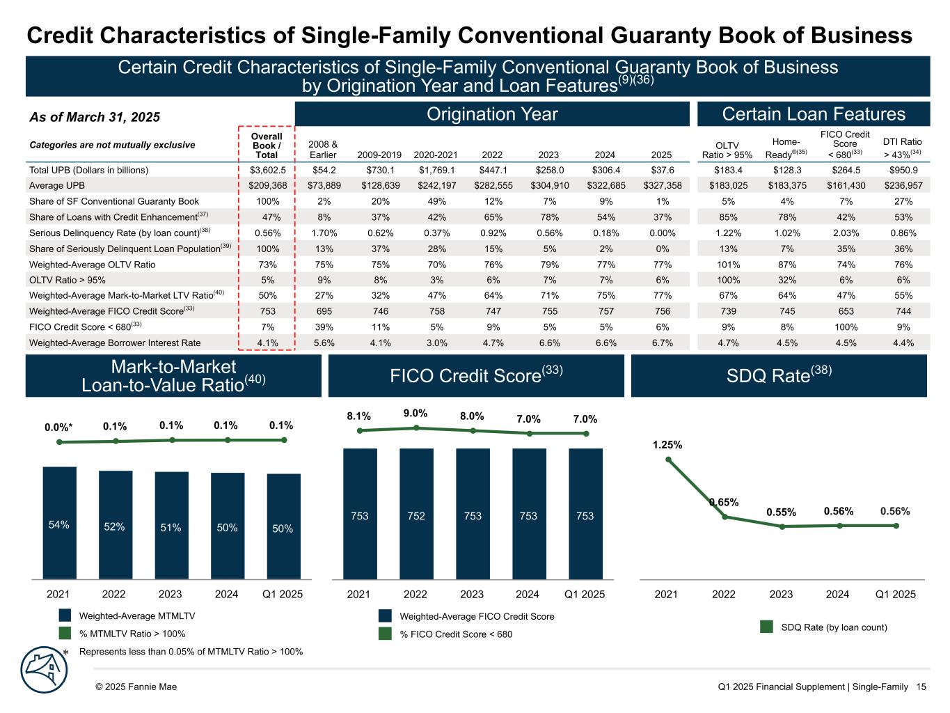 Q1 2025 Financial Supplement | Single-Family 14© 2025 Fannie Mae DRAFT 43% 13% 4% 8% 10% 33% 62% 86% 83% 78% 24% 25% 10% 9% 12% 2021 2022 2023 2024 Q1 2025 756 747 755 758 757 6.0% 8.0% 6.0% 5.0% 6.0% 2021 2022 2023 2024 Q1 2025 Credit Characteristics of Single-Family Conventional Loan Acquisitions Certain Credit Characteristics of Single-Family Conventional Loans by Acquisition Period Q1 2025 Acquisition Credit Profile by Certain Loan Features Categories are not mutually exclusive Q1 2024 Q2 2024 Q3 2024 Q4 2024 Full Year 2024 Q1 2025 OLTV Ratio > 95% Home- Ready®(35) FICO Credit Score < 680(33) DTI Ratio > 43%(34) Total UPB (Dollars in billions) $62.3 $85.9 $93.1 $84.7 $326.0 $64.3 $4.0 $4.1 $3.9 $24.6 Weighted-Average OLTV Ratio 78% 78% 77% 76% 77% 77% 97% 84% 69% 79% OLTV Ratio > 95% 7% 7% 7% 6% 7% 6% 100% 21% 1% 6% Weighted-Average FICO® Credit Score(33) 757 759 759 758 758 757 754 749 655 751 FICO Credit Score < 680(33) 5% 5% 5% 5% 5% 6% 1% 7% 100% 7% DTI Ratio > 43%(34) 37% 37% 37% 35% 36% 38% 40% 59% 43% 100% Fixed-rate 99% 99% 99% 100% 99% 99% 100% 100% 100% 99% Primary Residence 92% 93% 93% 94% 93% 94% 100% 100% 96% 95% HomeReady®(35) 6% 7% 7% 6% 7% 6% 21% 100% 7% 10% 69% 75% 78% 77% 77% 3.0% 5.0% 6.0% 7.0% 6.0% 2021 2022 2023 2024 Q1 2025 Original Loan-to-Value Ratio FICO Credit Score(33) Acquisitions by Loan Purpose Cash-out Refinance Purchase Other Refinance Weighted-Average OLTV Ratio % OLTV Ratio > 95% Weighted-Average FICO Credit Score % FICO Credit Score < 680