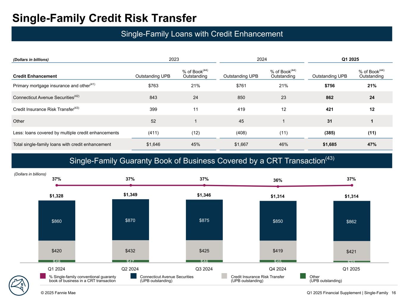 Q1 2025 Financial Supplement | Single-Family 15© 2025 Fannie Mae DRAFT 1.25% 0.65% 0.55% 0.56% 0.56% 2021 2022 2023 2024 Q1 2025 Certain Credit Characteristics of Single-Family Conventional Guaranty Book of Business by Origination Year and Loan Features(9)(36) As of March 31, 2025 Origination Year Certain Loan Features Categories are not mutually exclusive Overall Book / Total 2008 & Earlier 2009-2019 2020-2021 2022 2023 2024 2025 OLTV Ratio > 95% Home- Ready®(35) FICO Credit Score < 680(33) DTI Ratio > 43%(34) Total UPB (Dollars in billions) $3,602.5 $54.2 $730.1 $1,769.1 $447.1 $258.0 $306.4 $37.6 $183.4 $128.3 $264.5 $950.9 Average UPB $209,368 $73,889 $128,639 $242,197 $282,555 $304,910 $322,685 $327,358 $183,025 $183,375 $161,430 $236,957 Share of SF Conventional Guaranty Book 100% 2% 20% 49% 12% 7% 9% 1% 5% 4% 7% 27% Share of Loans with Credit Enhancement(37) 47% 8% 37% 42% 65% 78% 54% 37% 85% 78% 42% 53% Serious Delinquency Rate (by loan count)(38) 0.56% 1.70% 0.62% 0.37% 0.92% 0.56% 0.18% 0.00% 1.22% 1.02% 2.03% 0.86% Share of Seriously Delinquent Loan Population(39) 100% 13% 37% 28% 15% 5% 2% 0% 13% 7% 35% 36% Weighted-Average OLTV Ratio 73% 75% 75% 70% 76% 79% 77% 77% 101% 87% 74% 76% OLTV Ratio > 95% 5% 9% 8% 3% 6% 7% 7% 6% 100% 32% 6% 6% Weighted-Average Mark-to-Market LTV Ratio(40) 50% 27% 32% 47% 64% 71% 75% 77% 67% 64% 47% 55% Weighted-Average FICO Credit Score(33) 753 695 746 758 747 755 757 756 739 745 653 744 FICO Credit Score < 680(33) 7% 39% 11% 5% 9% 5% 5% 6% 9% 8% 100% 9% Weighted-Average Borrower Interest Rate 4.1% 5.6% 4.1% 3.0% 4.7% 6.6% 6.6% 6.7% 4.7% 4.5% 4.5% 4.4% Credit Characteristics of Single-Family Conventional Guaranty Book of Business 753 752 753 753 753 8.1% 9.0% 8.0% 7.0% 7.0% 2021 2022 2023 2024 Q1 2025 54% 52% 51% 50% 50% 0.0%* 0.1% 0.1% 0.1% 0.1% 2021 2022 2023 2024 Q1 2025 Mark-to-Market Loan-to-Value Ratio(40) FICO Credit Score(33) SDQ Rate(38) Weighted-Average MTMLTV % MTMLTV Ratio > 100% * Represents less than 0.05% of MTMLTV Ratio > 100% Weighted-Average FICO Credit Score % FICO Credit Score < 680 SDQ Rate (by loan count)