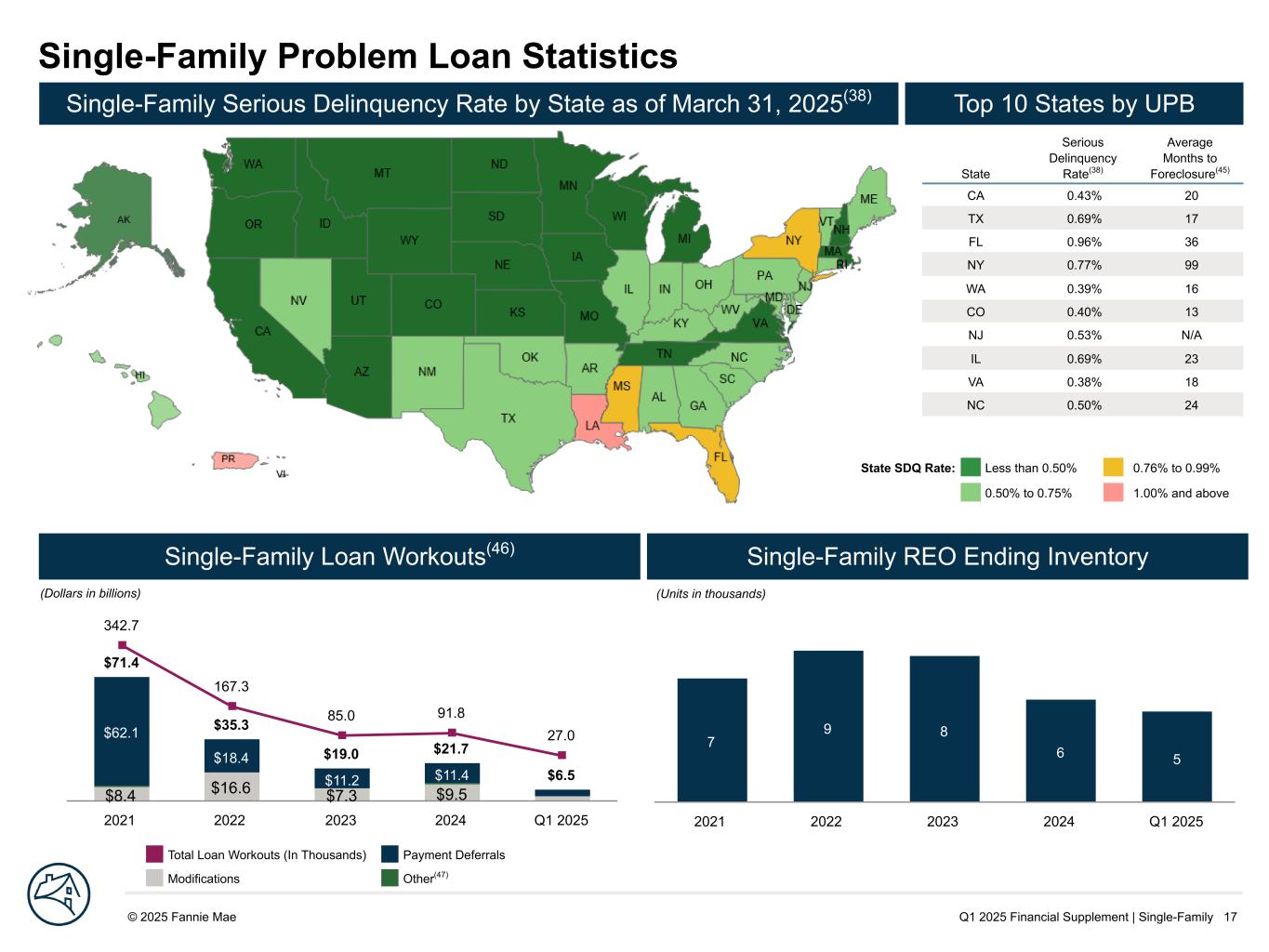 Q1 2025 Financial Supplement | Single-Family 17© 2025 Fannie Mae DRAFT $71.4 $35.3 $19.0 $21.7 $6.5 $8.4 $16.6 $7.3 $9.5 $62.1 $18.4 $11.2 $11.4 342.7 167.3 85.0 91.8 27.0 2021 2022 2023 2024 Q1 2025 Single-Family Problem Loan Statistics Single-Family Serious Delinquency Rate by State as of March 31, 2025(38) Top 10 States by UPB Single-Family Loan Workouts(46) Single-Family REO Ending Inventory Total Loan Workouts (In Thousands) Payment Deferrals Modifications Other(47) State SDQ Rate: Less than 0.50% 0.76% to 0.99% 0.50% to 0.75% 1.00% and above (Dollars in billions) State Serious Delinquency Rate(38) Average Months to Foreclosure(45) CA 0.43% 20 TX 0.69% 17 FL 0.96% 36 NY 0.77% 99 WA 0.39% 16 CO 0.40% 13 NJ 0.53% N/A IL 0.69% 23 VA 0.38% 18 NC 0.50% 24 7 9 8 6 5 2021 2022 2023 2024 Q1 2025 (Units in thousands)