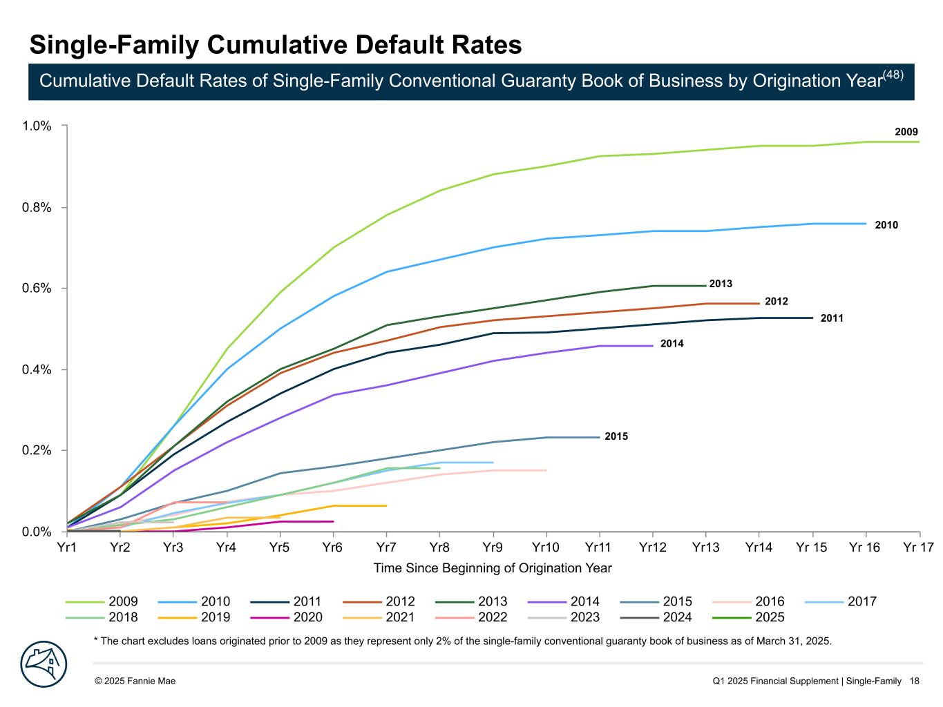 Q1 2025 Financial Supplement | Single-Family 18© 2025 Fannie Mae DRAFT Time Since Beginning of Origination Year 2009 2010 2011 2012 2013 2014 2015 2016 2017 2018 2019 2020 2021 2022 2023 2024 2025 Yr1 Yr2 Yr3 Yr4 Yr5 Yr6 Yr7 Yr8 Yr9 Yr10 Yr11 Yr12 Yr13 Yr14 Yr 15 Yr 16 Yr 17 0.0% 0.2% 0.4% 0.6% 0.8% 1.0% Single-Family Cumulative Default Rates Cumulative Default Rates of Single-Family Conventional Guaranty Book of Business by Origination Year(48) * The chart excludes loans originated prior to 2009 as they represent only 2% of the single-family conventional guaranty book of business as of March 31, 2025. 2009 2010 2013 2012 2011 2014 2015